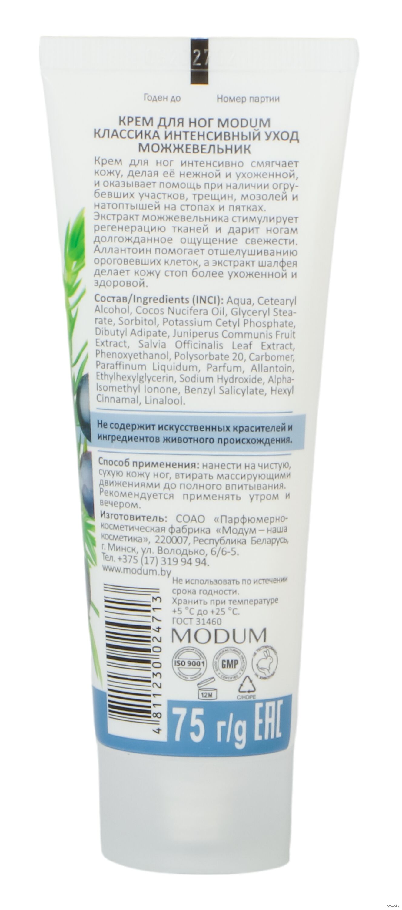 Крем для ног интенсивно смягчает кожу, делая ее нежной и ухоженной, и оказывает помощь при наличии огрубевших участков, трещин, мозолей и натоптышей на стопах и пятках.