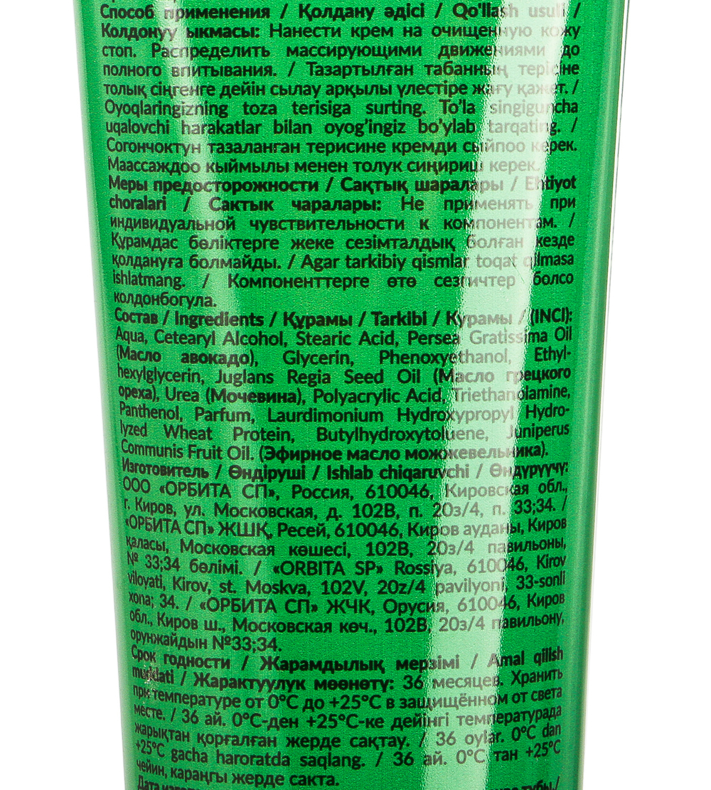 Aqua, Stearic Acid, Ceto Stearyl Alcohol, Persea Gratissima Oil (Масло авокадо), Glycerin, Walnut Oil (Масло грецкого ореха), Urea (Мочевина), Panthenol, Carbomer, Tri- ethanolamine, Parfum, Methylisothiazolinone, Cationic Hyd- rolyzed Wheat Protein, Jjuniperus Communis (Juniper) Essential Fruit Oil (Эфирное масло можжевельника).
