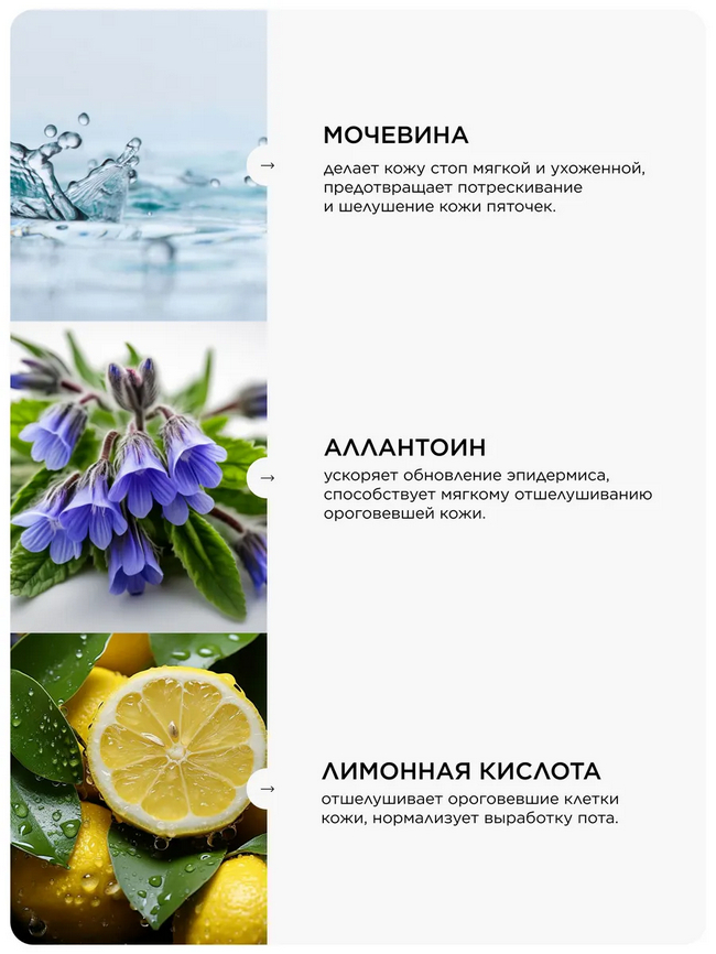 Мочевина помогает ускорить регенерацию клеток и заживляет трещины, обеспечивает увлажняющий эффект. Щелочь способствует мгновенному размягчению кожи, которая успела огрубеть и ороговеть. Обеспечивает пилинг, устраняя мозоли и натоптыши.