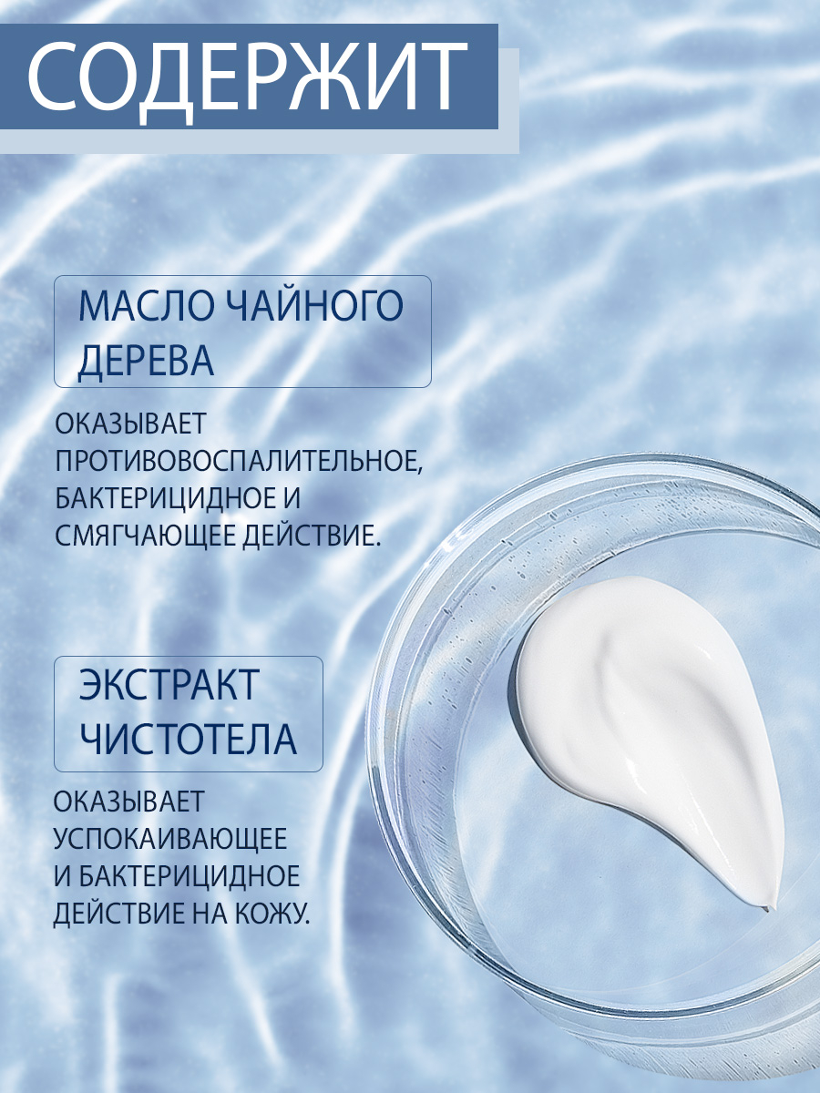 Масло чайного дерева обладает широким спектром антимикробной активности, экстракт чистотела и эфирное масло мяты оказывают успокаивающее, регенерирующее и бактерицидное действие.