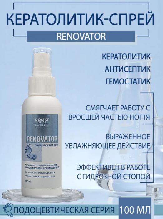 Кератолитик-спрей "Реноватор" применяется для размягчения жесткого, огрубевшего околоногтевого валика, очистки и обеззараживания боковых пазух. Снижает влияние раздражающих факторов на кожный покров, блокирует выделения, минимизирует дискомфортные ощущения. Не делает пористой ногтевую пластину, облегчая установку коррекционных систем.