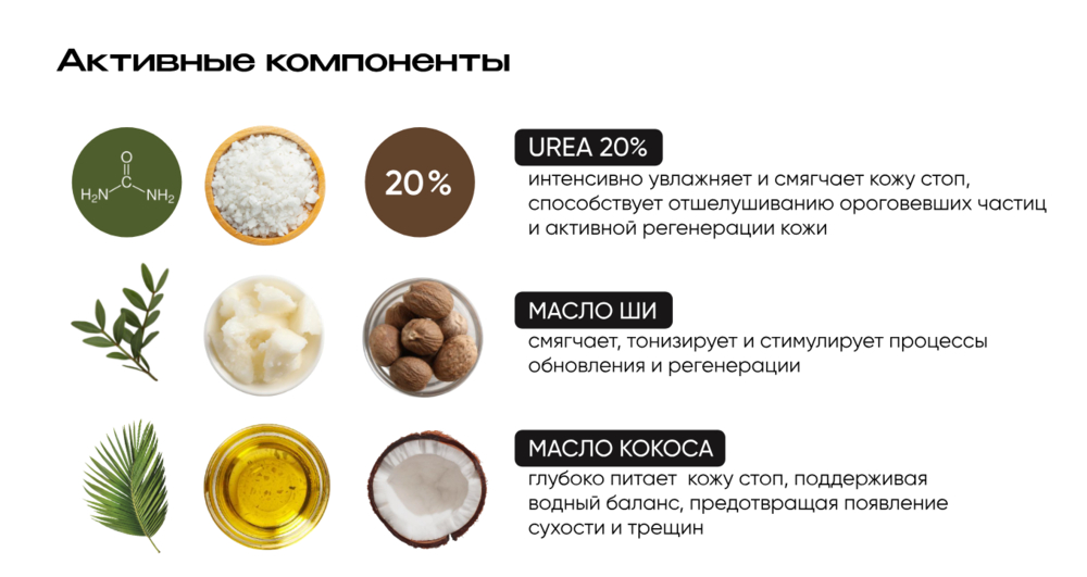 | Активные вещества | Кокосовое масло, масло ши, мочевина |