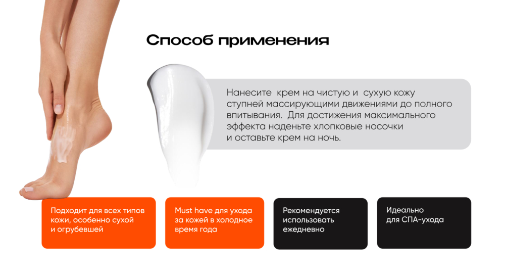 Нанесите крем на чистую и сухую кожу ступней массирующими движениями до полного впитывания. Для достижения максимального эффекта наденьте хлопковые носочки и оставьте крем на ночь. Рекомендуется использовать ежедневно.Состав