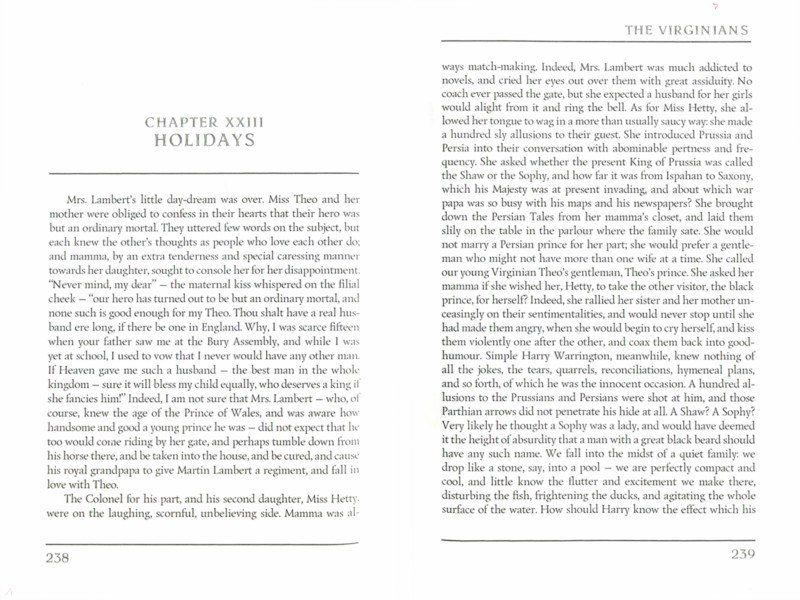 William Makepeace Thackeray (1811-1863) was a British author and novelist mostly known for his satirical works such as "Vanity Fair" that showed an ironic representation of the British society of those times. "The Virginians" is a historical novel, a sequel to "The History of Henry Esmond, Esq" loosely linked to "The History of Pendennis." It tells the story of Henry Esmond's twin grandsons, George and Henry Warrington. Henry's romantic connection with an older woman makes him join the British army and fight under the command of General Wolfe during the capture of Quebec. During the American War of Independence, he takes the revolutionary side. This event forces George, who is also a British officer, to resign rather than go into battle against his brother.