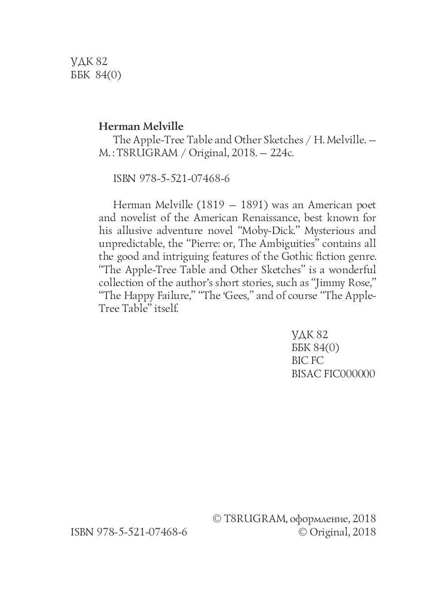 Herman Melville (1819-1891) was an American poet and novelist of the American Renaissance, best known for his allusive adventure novel "Moby-Dick." Mysterious and unpredictable, the "Pierre: or, The Ambiguities" contains all the good and intriguing features of the Gothic fiction genre. "The Apple-Tree Table and Other Sketches" is a wonderful collection of the author's short stories, such as "Jimmy Rose," "The Happy Failure," "The 'Gees," and of course "The Apple-Tree Table" itself.
