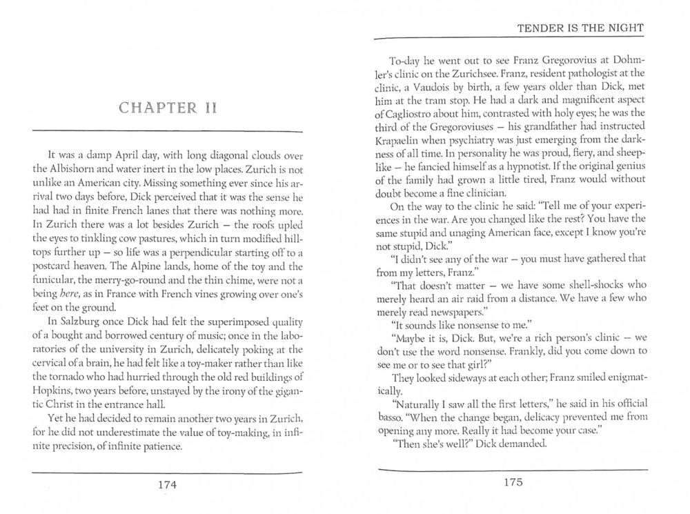 F.S. Fitzgerald was an American writer, whose works illustrate the Jazz Age. "Tender is the Night" tells the story of rise and fall of Dick Diver, a promising young psychoanalyst, and his wife, Nicole, who is also one of his patients. The early 1930s, when Fitzgerald worked on the book, were the darkest years of his life, and the novel's bleakness reflects the author's own experiences.