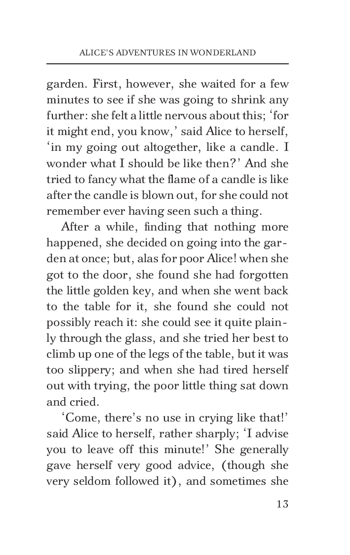 "Alice was beginning to get very tired of sitting by her sister on the bank, and of having nothing to do: once or twice she had peeped into the book her sister was reading, but it had no pictures or conversations in it, and what is the use of a book, thought Alice, without pictures or conversations?"