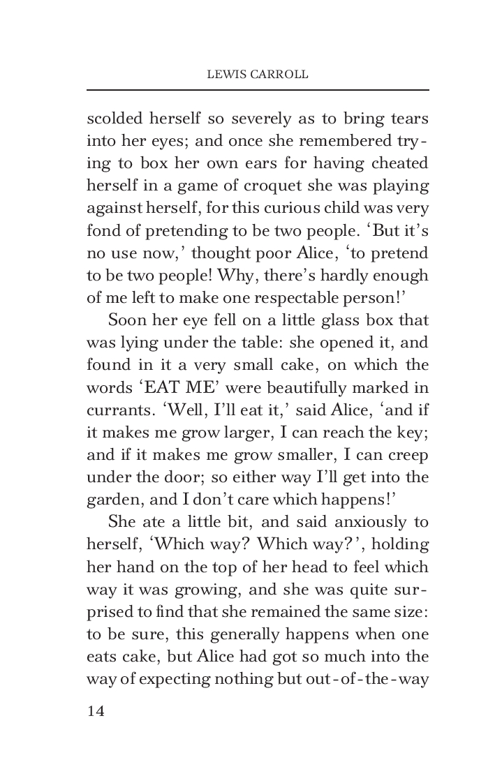 Люис Кэрролл – английский писатель, создавший свой собственный жанр, названный "парадоксальная литература" и подаривший миру произведения, которые и по сей день остаются самыми любимыми среди читателей всех возрастов. "Алиса в стране чудес" и "Алиса в зазеркалье", рассказывает о девочке по имени Алиса, оказавшейся в удивительной стране, столь не похожей на привычный нам мир. Здесь еда и напитки могут заставить вас уменьшиться или увеличиться, коты улыбаются и исчезают прямо у вас на глазах, чаепитие длится вечно, а все обитатели слегка сумасшедшие. Страна, в которой с каждой минутой все становится "чудесатее и чудесатее".