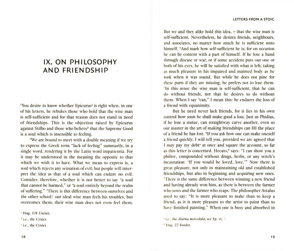 Seneca's letters read like a diary, or a handbook of philosophical meditations. Often beginning with observations on daily life, the letters focus on many traditional themes of Stoic philosophy, such as the contempt of death, the value of friendship and virtue as the supreme good.