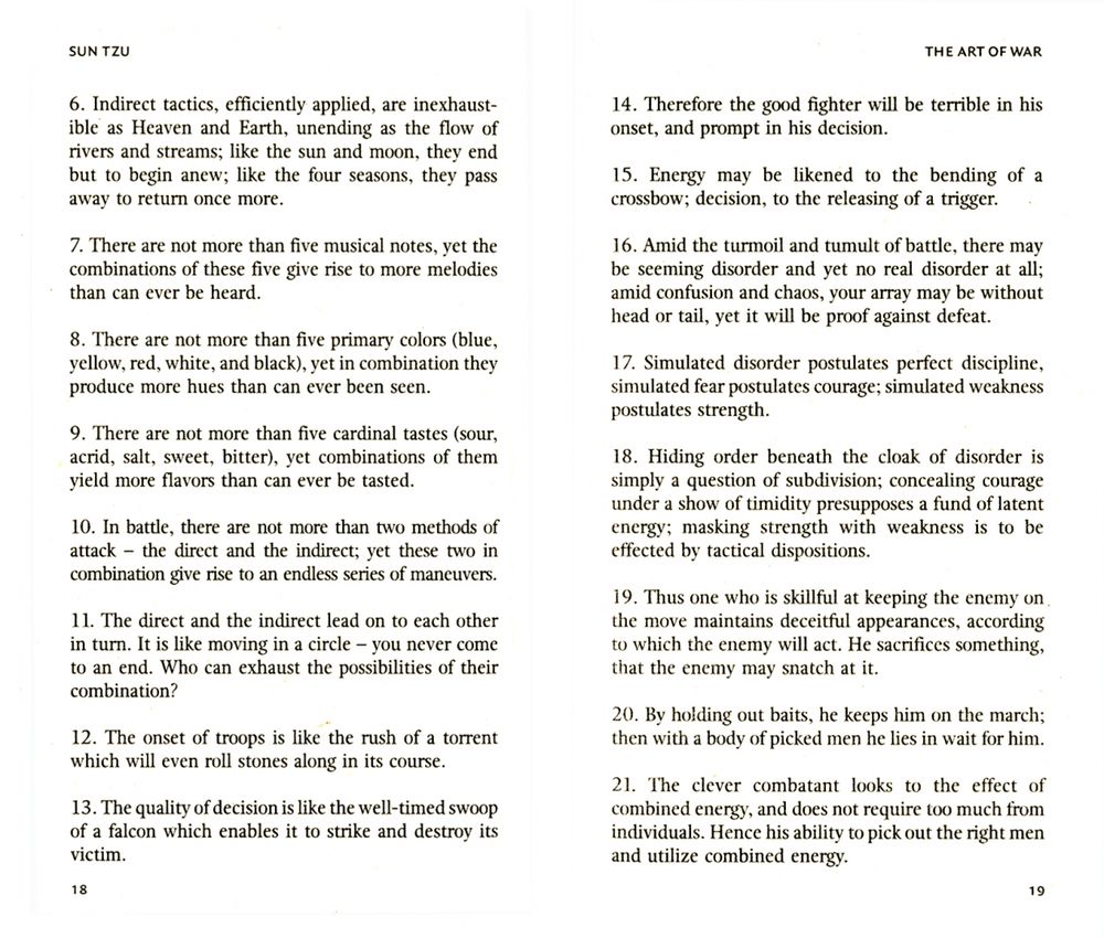 Sun Tzu's timeless appraisal of the different aspects of warfare are laid out in 13 chapters, including sections on "Laying Plans", "Waging War" and "Terrain". Words that are as resonant today in every aspect of our lives as they were when he wrote them.