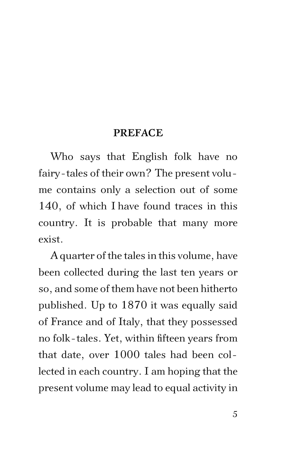 В сборнике вы найдете 43 сказки, среди которых: "Джек и золотая табакерка", "Три медведя", "Золотая рука" и многие другие. Текст произведений представлен в оригинале, без адаптации и сокращений. Окунитесь в потрясающий мир классических английских сказок!