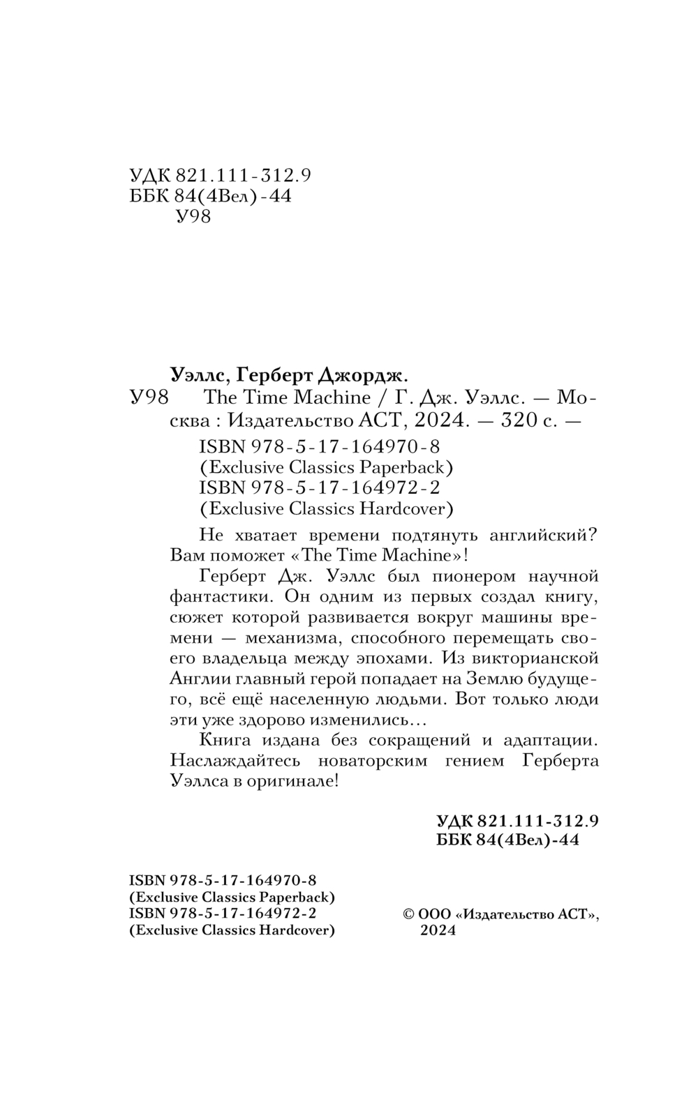 Герберт Дж. Уэллс был пионером научной фантастики. Он одним из первых создал книгу, сюжет которой развивается вокруг машины времени -- механизма, способного перемещать своего владельца между эпозами. Из викторианской Англии главный герой попадает на Землю будущего, всё ещё населенную людьми. Вот только люди эти уже здорово изменились...