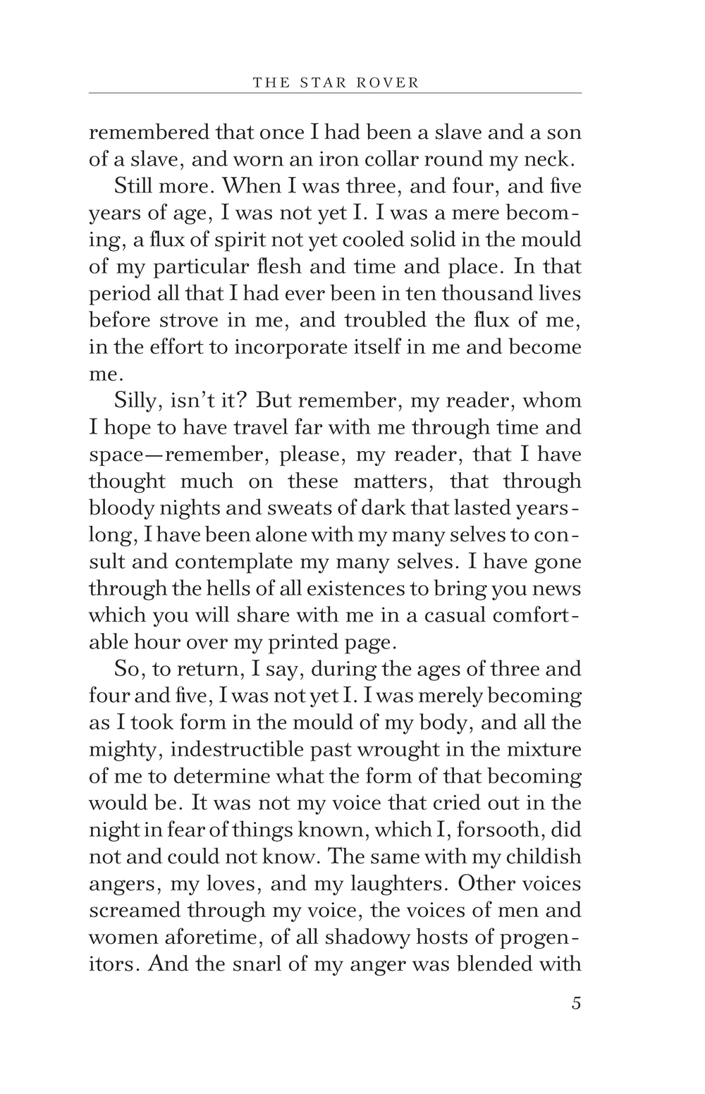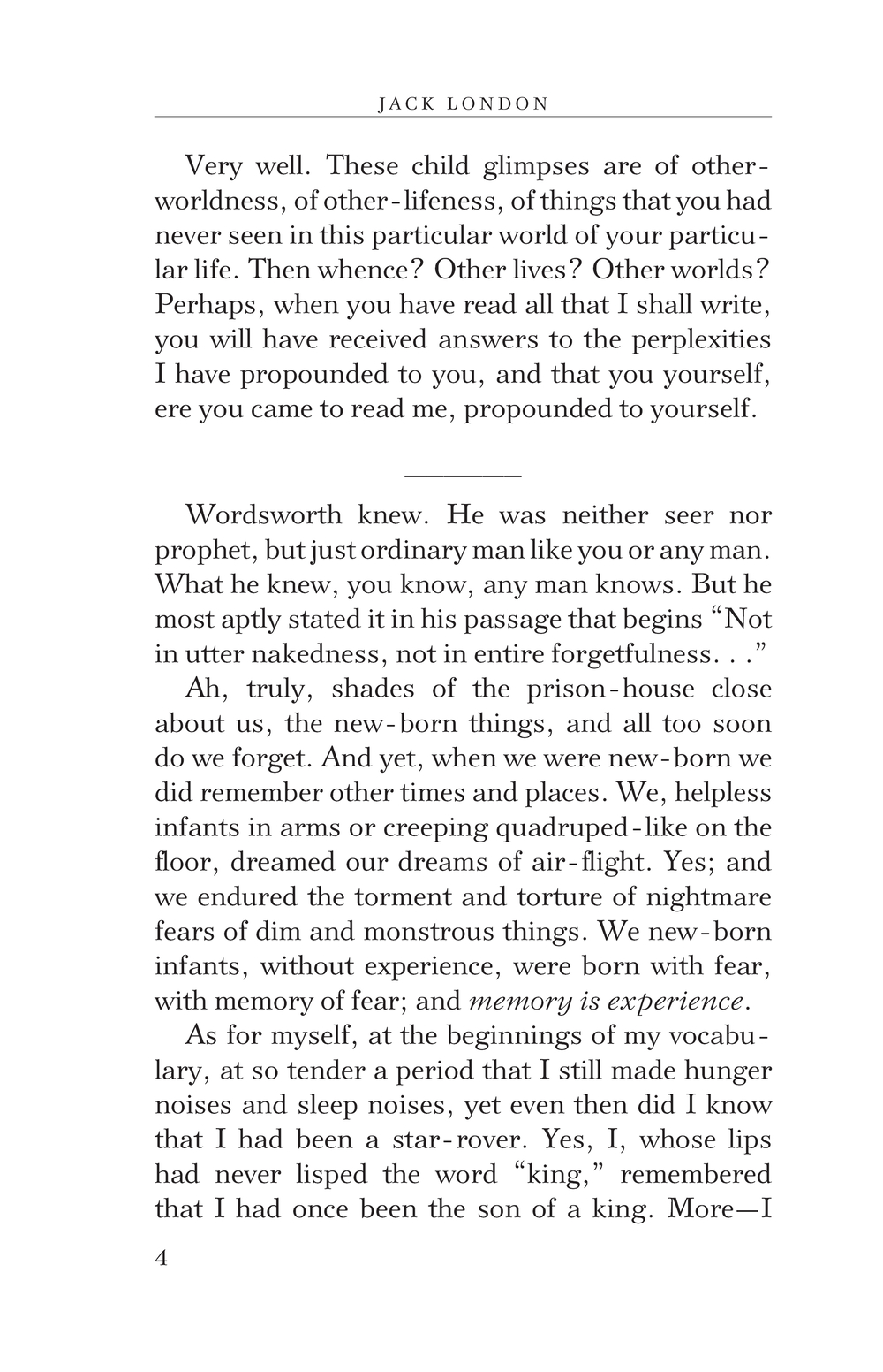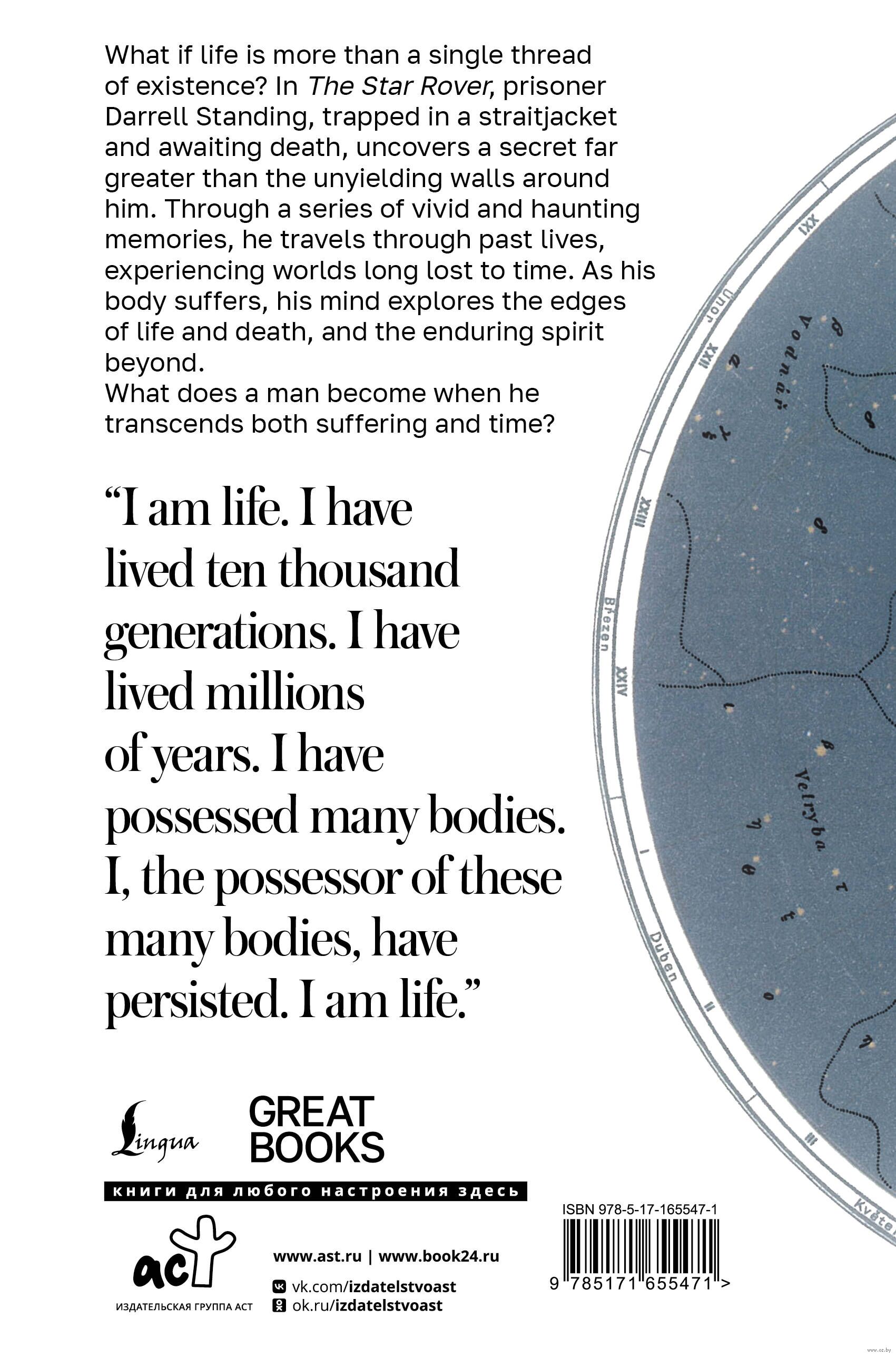 В романе Джека Лондона "Странник по звездам" Даррелл Стэндинг, осужденный на пожизненное заключение в одиночной камере и пытки смирительной рубашкой, сбегает от невыносимых страданий в свои прошлые жизни. Викинг, переживший кровавые битвы и рабство, корейский придворный-интриган, моряк на необитаемом острове – бесконечные перерождения, вечный круговорот существования, который постигает Стэндинг вместе со старой, как горы, истиной.