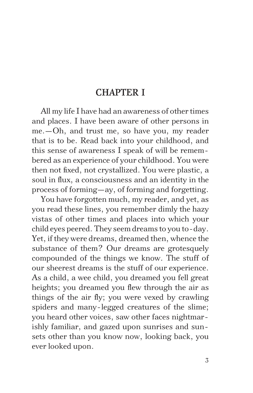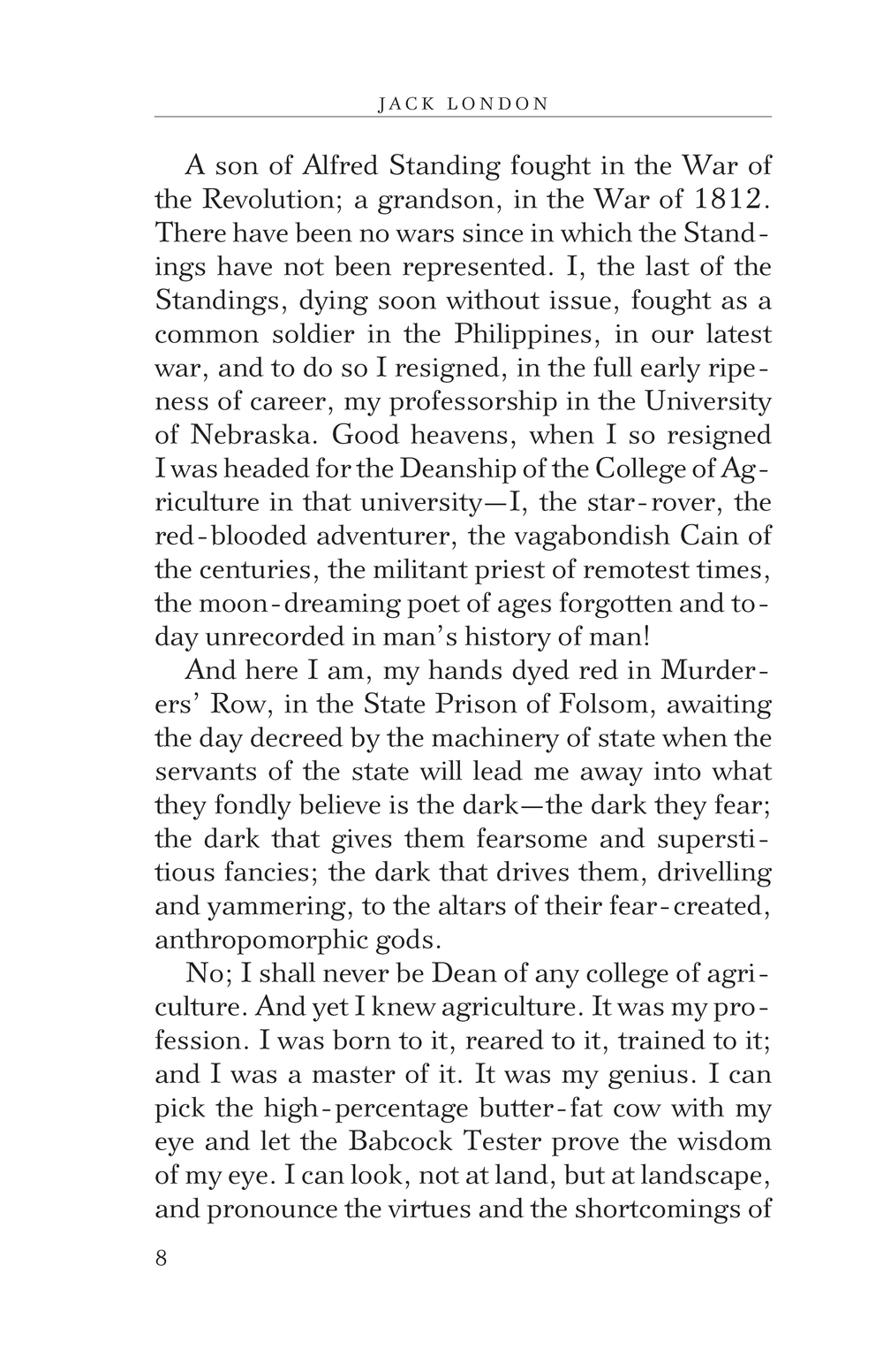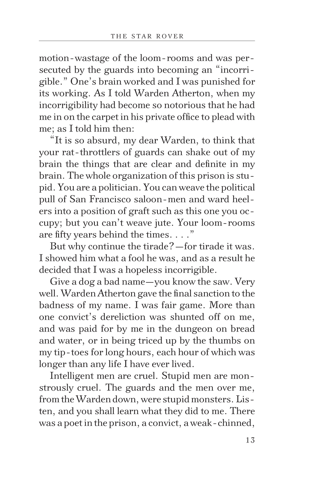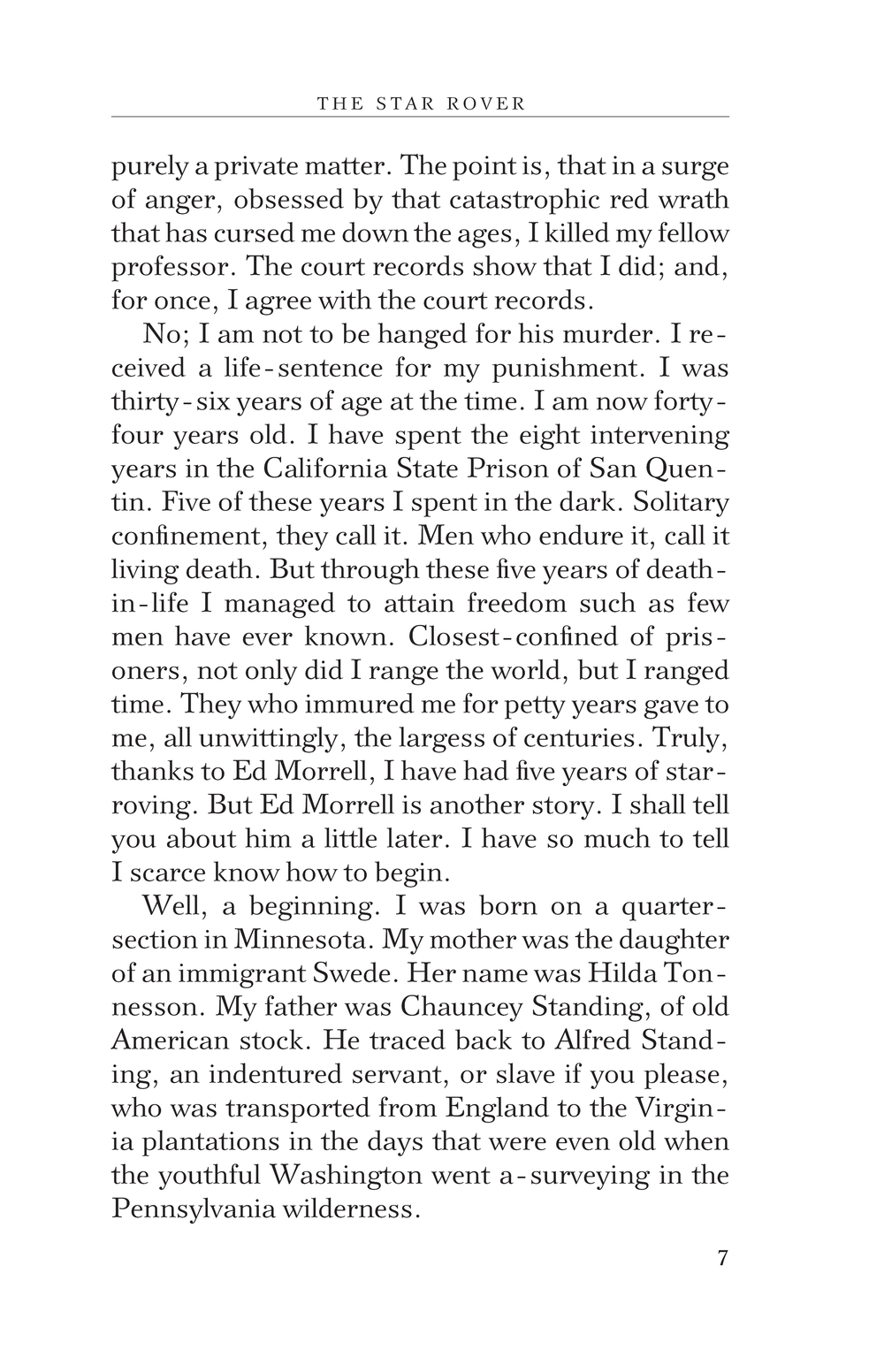 В романе Джека Лондона "Странник по звездам" Даррелл Стэндинг, осужденный на пожизненное заключение в одиночной камере и пытки смирительной рубашкой, сбегает от невыносимых страданий в свои прошлые жизни. Викинг, переживший кровавые битвы и рабство, корейский придворный-интриган, моряк на необитаемом острове – бесконечные перерождения, вечный круговорот существования, который постигает Стэндинг вместе со старой, как горы, истиной.