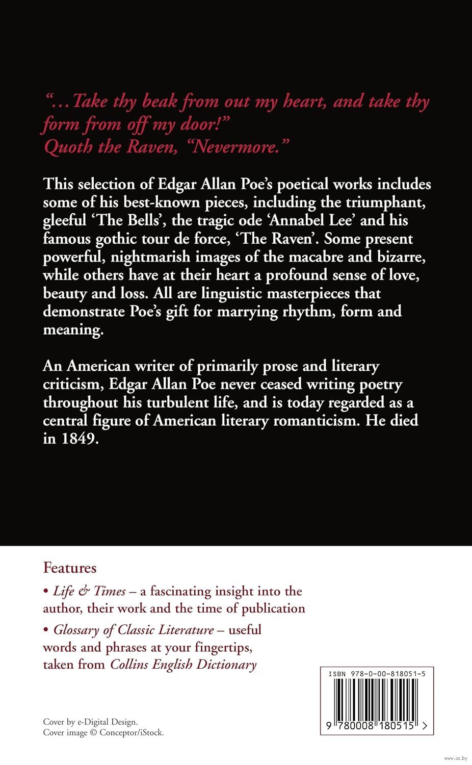 HarperCollins is proud to present its incredible range of best-loved, essential classics.‘ “…Take thy beak from out my heart, and take thy form from off my door!”Quoth the Raven, “Nevermore.” ’This selection of Edgar Allan Poe’s poetical works includes some of his best-known pieces, including the triumphant, gleeful ‘The Bells’, the tragic ode ‘Annabel Lee’ and his famous gothic tour de force, ‘The Raven’. Some present powerful, nightmarish images of the macabre and bizarre, while others have at their heart a profound sense of love, beauty and loss. All are linguistic masterpieces that demonstrate Poe’s gift for marrying rhythm, form and meaning.An American writer of primarily prose and literary criticism, Edgar Allen Poe never ceased writing poetry throughout his turbulent life, and is today regarded as a central figure of American literary romanticism. He died in 1849.