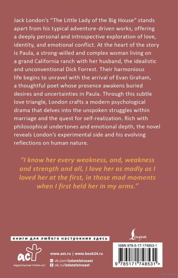 "Маленькая хозяйка большого дома" – один из самых глубоких и психологически тонких романов Джека Лондона. В центре сюжета – Паула, сильная и независимая женщина, разрывающаяся между любовью к мужу и внезапным чувством к другому мужчине. На фоне живописной природы Калифорнии разворачивается драма человеческих чувств, где сталкиваются долг, страсть и стремление к личной свободе. Роман отличается богатым внутренним миром персонажей, философской глубиной и зрелым стилем автора, став ярким примером перехода Лондона от приключенческой прозы к серьёзной психологической литературе.
