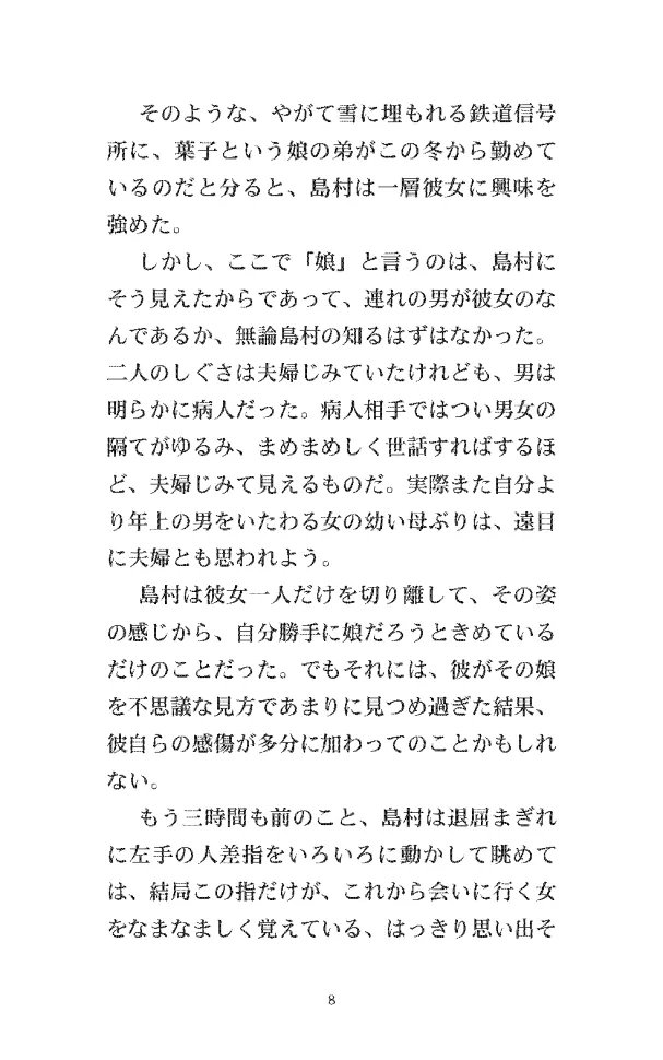 Это история отношений людей из разных миров: столичного жителя и влюбленной в него юной гейши из маленького городка в горах. Кавабата оставляет за кадром подробности жизни главных героев, зато с помощью диалогов создает необыкновенно зримые портреты персонажей – правдивые в своей искренности, достоверные в сомнениях. В романе воссоздана полная красоты и поэзии поразительная атмосфера городка, заснеженной страны. Его нужно читать без спешки, глядя на то, как кружится и падает снег, укутывая землю и умиротворяя душу. Он полон печального очарования, нежный и трогательный, как снежные хлопья, мотыльки и Млечный Путь...