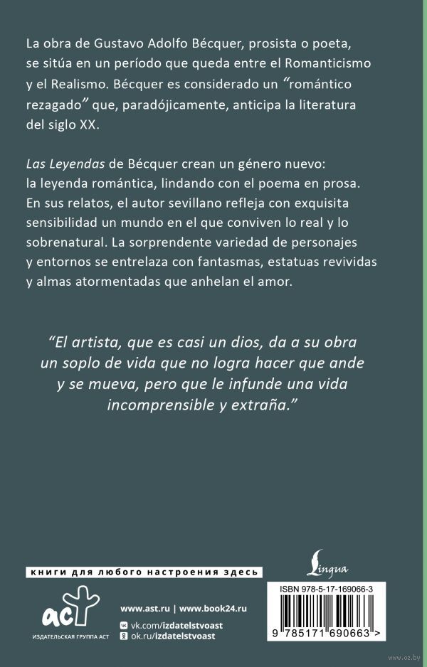 Легенды Беккера, вдохновленные природой и историей Кастилии, переносят читателя в эпоху славных королей, благородных рыцарей и прекрасных дам. От воина, полюбившего прекрасную статую, до охотника, преследующего белую лань, – каждый из персонажей жаждет того, чего не может иметь, и расплачивается за это.