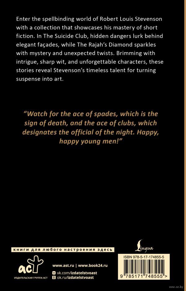 Этот сборник открывает двери в мир тайн и приключений Роберта Льюиса Стивенсона. Здесь вас ждут истории о тайных обществах и загадочных заговорах, о бесценном сокровище, за которое готовы рискнуть жизнью, и о дерзких авантюрах, где каждый шаг может стать решающим. Каждый рассказ хранит свою интригу, а фирменный стиль Стивенсона превращает чтение в увлекательное путешествие, где до последней страницы невозможно предугадать развязку.