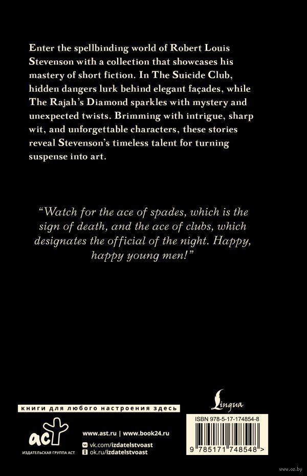 Этот сборник открывает двери в мир тайн и приключений Роберта Льюиса Стивенсона. Здесь вас ждут истории о тайных обществах и загадочных заговорах, о бесценном сокровище, за которое готовы рискнуть жизнью, и о дерзких авантюрах, где каждый шаг может стать решающим. Каждый рассказ хранит свою интригу, а фирменный стиль Стивенсона превращает чтение в увлекательное путешествие, где до последней страницы невозможно предугадать развязку.