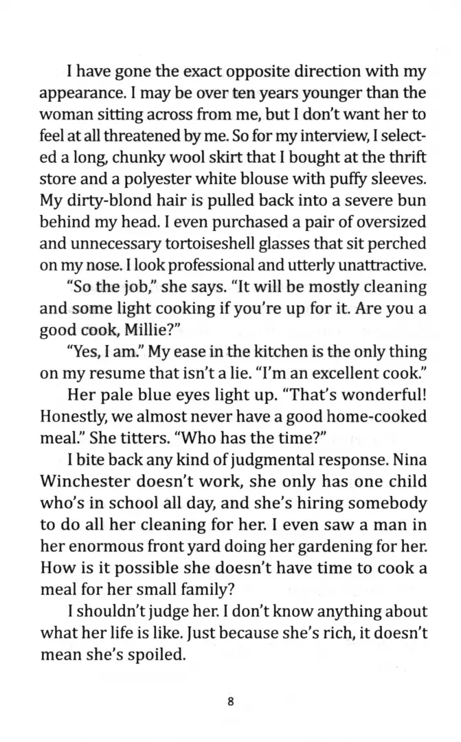 Милли Кэллоуэй живет в своем старом автомобиле и отчаянно пытается найти любую работу. Когда богатая супружеская пара предлагает ей работу горничной с постоянным проживанием, она соглашается, не раздумывая, ведь в ее положении выбирать не приходится. Но дверь в ее комнату запирается лишь снаружи, а каждый из членов семьи имеет свои тайны...
