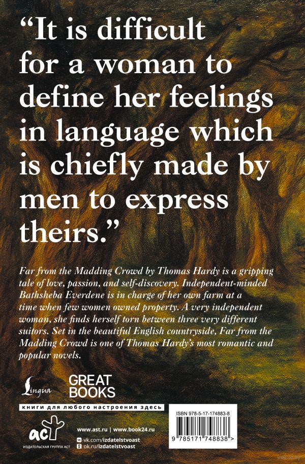 Батшеба Эвердин – сильная и независимая женщина, которая оказывается в центре любовного треугольника. Томас Харди исследует темы женской независимости, выбора и природы истинной любви на фоне поисков героиней своего пути и счастья. Он противопоставляет страсть и разум, с мастерством рисует картину человеческих эмоций и искушений, показывая, как наши выборы могут менять судьбы, а жизнь быть более жестокой, чем мы могли бы себе представить.