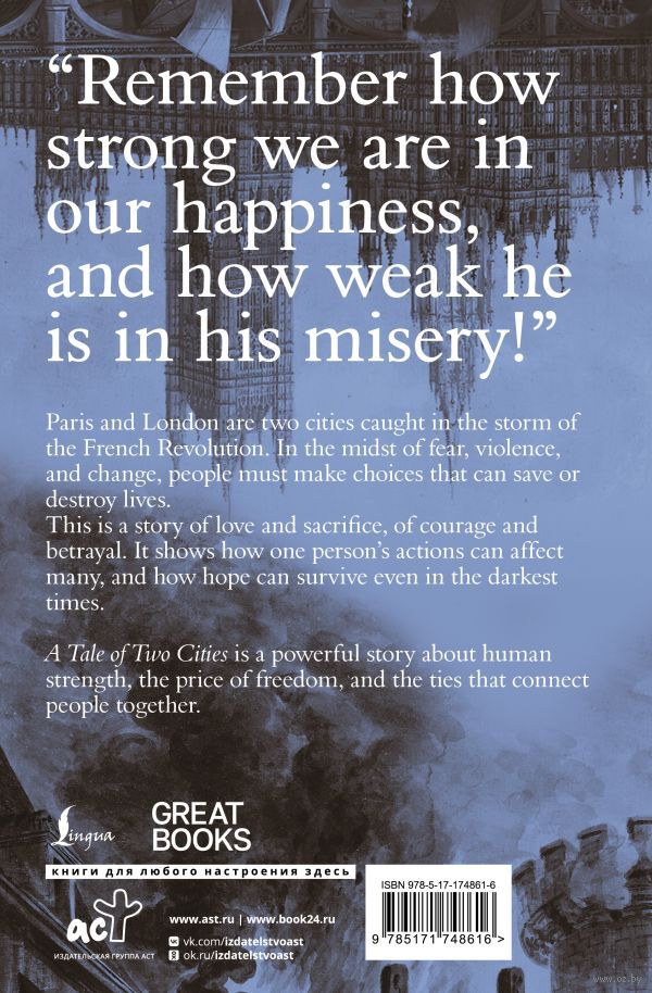 "Повесть о двух городах" – один из самых известных романов Чарльза Диккенса, действие которого разворачивается на фоне Великой французской революции. История охватывает судьбы людей, живущих в Лондоне и Париже, в эпоху, когда мир оказался расколот между жестокостью и надеждой, отчаянием и возрождением.