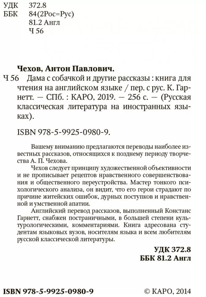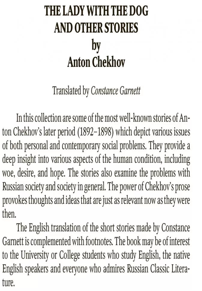 Вашему вниманию предлагаются переводы наиболее известных рассказов, относящихся к позднему периоду творчества А. П. Чехова.
