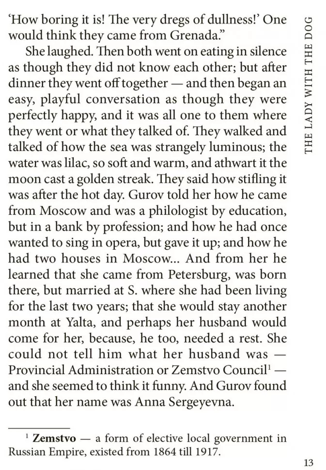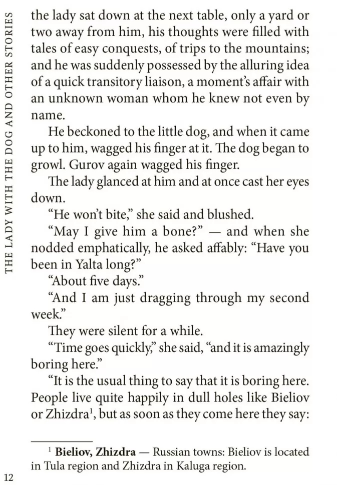 Английский перевод рассказов, выполненный Констанс Гарнетт, снабжен постраничными, в большей степени культурологическими, комментариями.