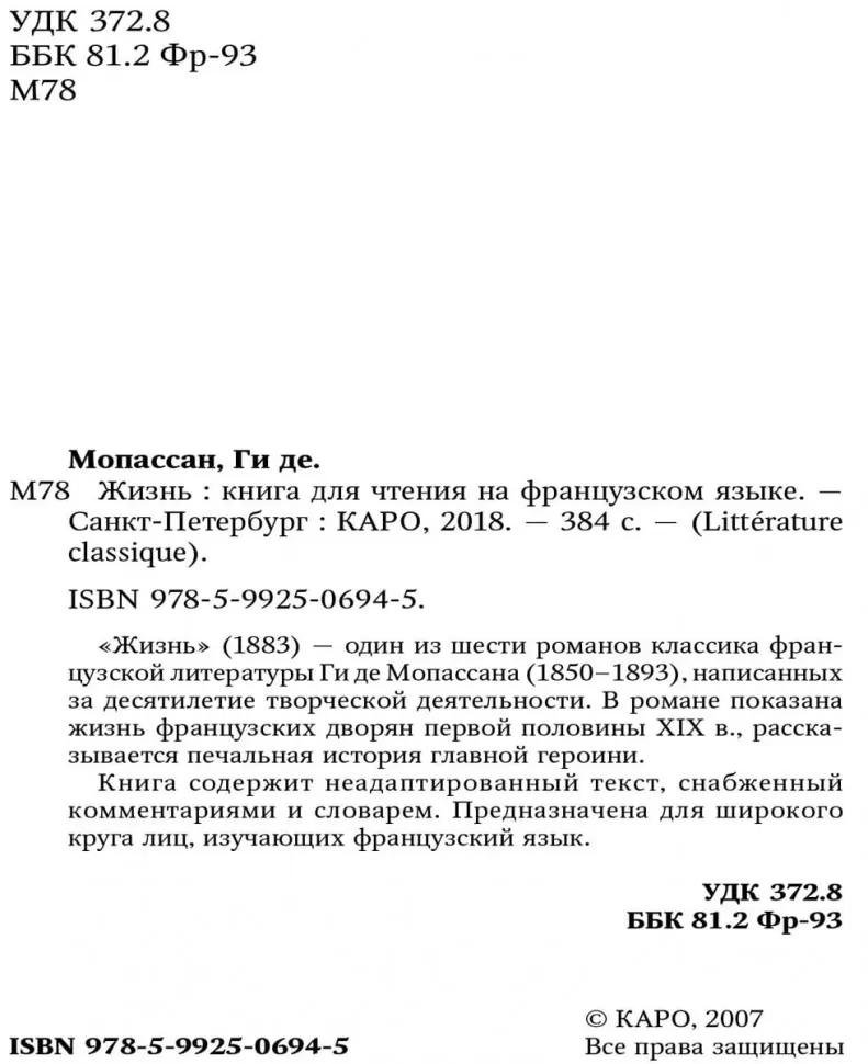 "Жизнь" (1883) один из шести романов классика французской литературы Гиде Мопассана (1850-1893), написанных за десятилетие творческой деятельности. В романе показана жизнь французских дворян первой половины XIX в., рассказывается печальная история главной героини.