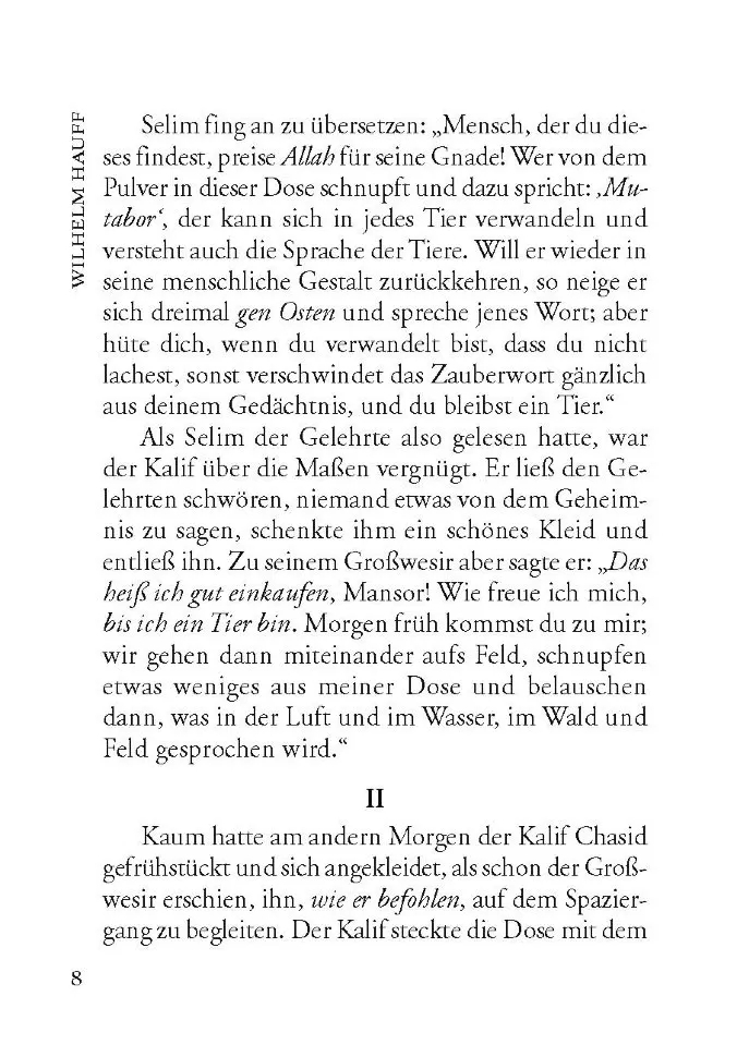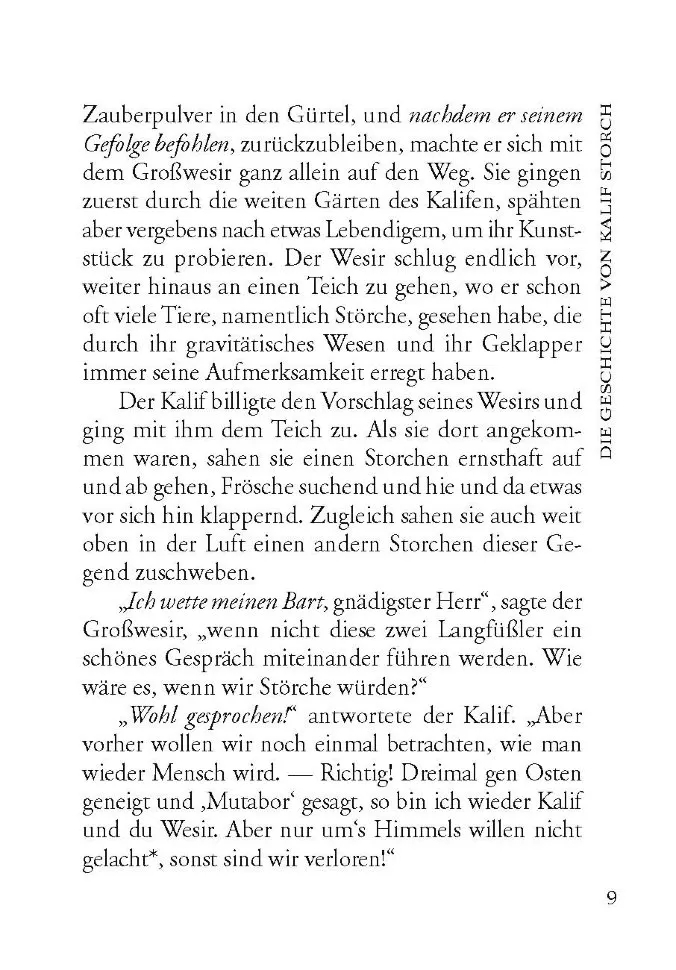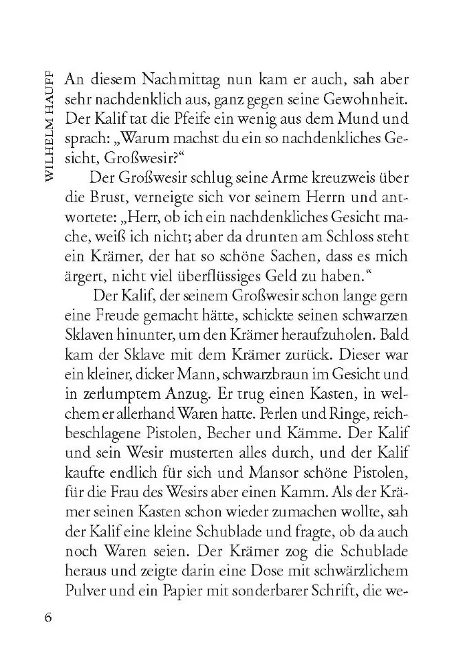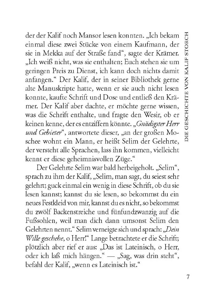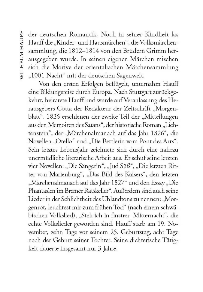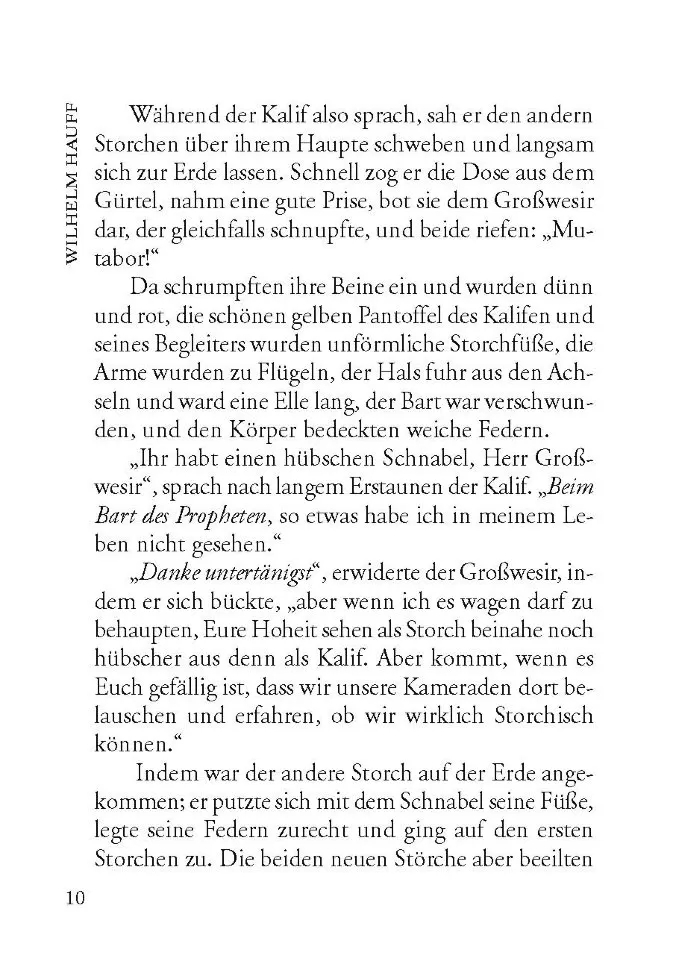 В книгу для чтения включены 7 сказок немецкого писателя-романтика Вильгельма Гауфа: "Die Geschichte von Kalif Storch", "Das Marchen vom falschen Prinzen", "Der Scheik von Alessandria und seine Sldaven", "Der Zwerg Nase", "Der Affe als Mensch", "Die Geschichte Almansors", "Die Sage vom Hirsch-gulden".