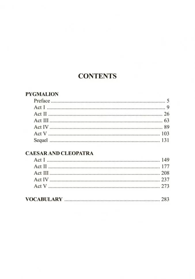 В издание вошли две пьесы автора. Одна из них – "Пигмалион" (1914) – повествует о простой цветочнице, ставшей настоящей леди. Другая – "Цезарь и Клеопатра" (1899), в которой юная девушка на глазах читателей превращается в настоящую царицу.