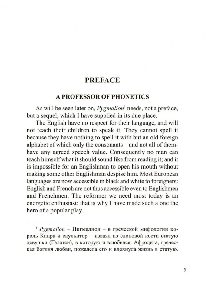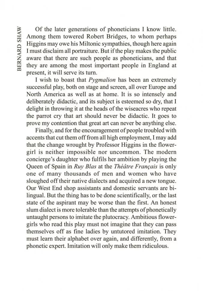One of George Bernard Shaw's best-known plays, Pygmalion was a rousing success on the London and New York stages, an entertaining motion picture and a great hit with its musical version, My Fair Lady. An updated and considerably revised version of the ancient Greek legend of Pygmalion and Galatea, the 20th-century story pokes fun at the antiquated British class system.
