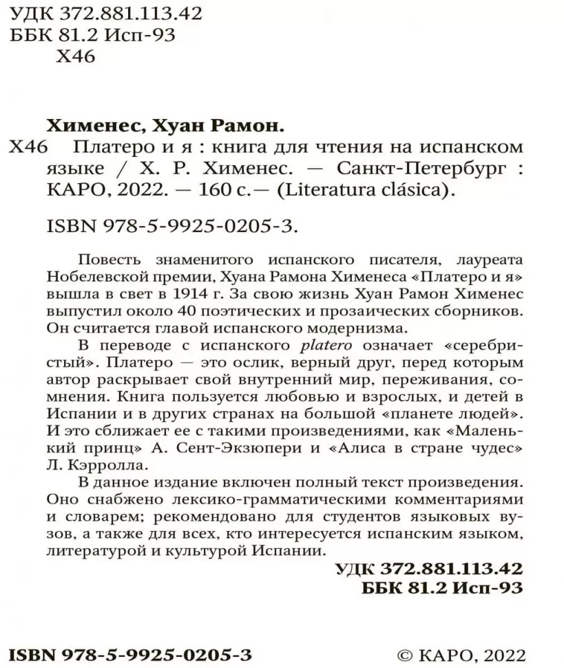 Повесть знаменитого испанского писателя, лауреата Нобелевской премии Хуана Рамона Хименеса "Платеро и я" вышла в свет в 1914 г. За свою жизнь Хуан Рамон Хименес выпустил около 40 поэтических и прозаических сборников. Он считается главой испанского модернизма.