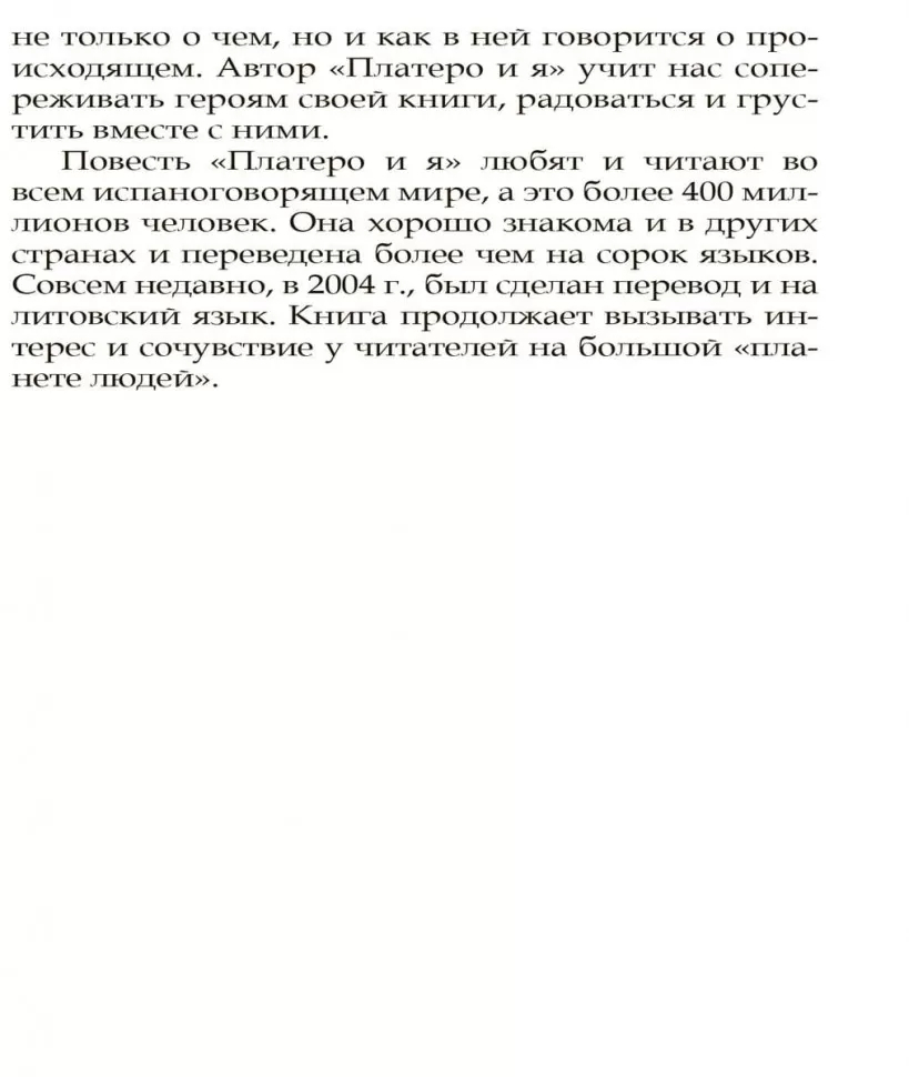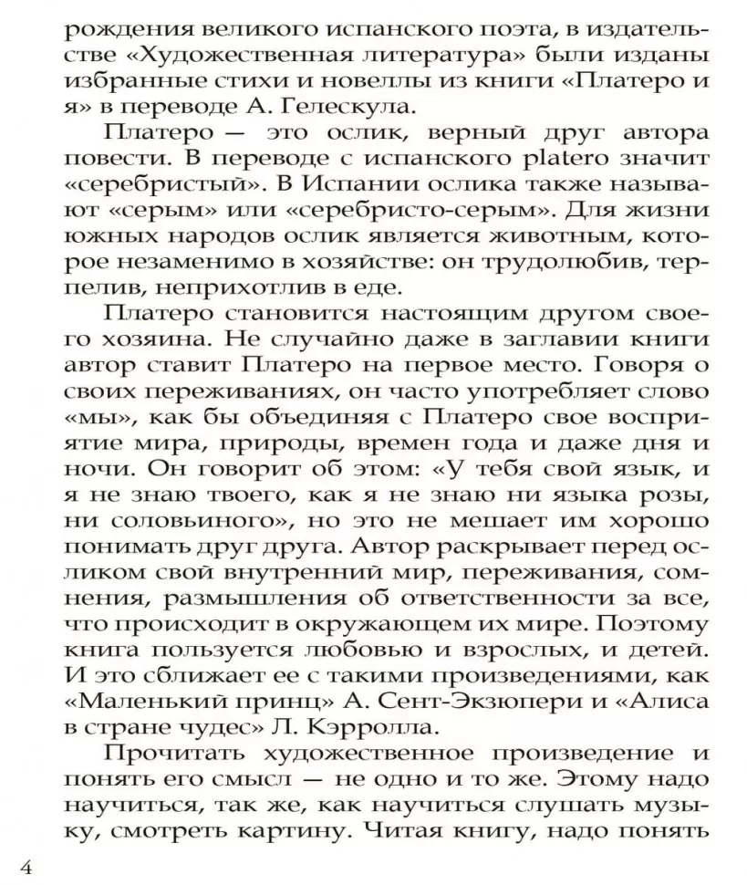 В переводе с испанского "platero" означает "серебристый". Платеро – это ослик, верный друг, перед которым автор раскрывает свой внутренний мир, переживания, сомнения. Книга пользуется любовью и взрослых, и детей в Испании и в других странах на большой "планете людей". И это сближает ее с такими произведениями, как "Маленький принц" А.Сент-Экзюпери и "Алиса в стране чудес" Л.Кэрролла.