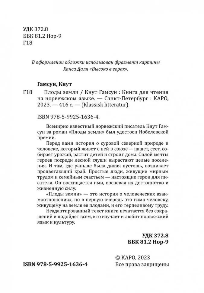 Всемирно известный норвежский писатель Кнут Гамсун за роман "Плоды земли" был удостоен Нобелевской премии. Перед вами история о суровой северной природе и человеке, который живёт с ней в союзе – пашет, сеет, собирает урожай, растит детей и строит дома. Силой мечты героев посреди лесной глуши вырастают целые поселения. И там, где раньше была дикая пустошь, возникает процветающий край. Простые люди, живущие мирным трудом и семейным счастьем – настоящие герои для писателя. Он восхищается ими, воспевая их достоинство и жизненную силу. "Плоды земли" – это история о человеческих взаимоотношениях, но в первую очередь это гимн человеку, живущему на земле её плодами, и его терпеливому труду. Неадаптированный текст книги печатается без сокращений и подойдёт всем, кто изучает и любит норвежский язык и культуру.