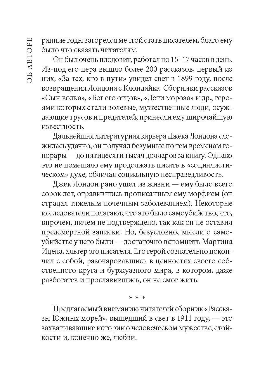 "Визитной карточкой" знаменитого американского писателя Джека Лондона, конечно же, являются его рассказы о суровых, мужественных золотоискателях, но предлагаемые вниманию читателей "Рассказы Южных морей" – не менее захватывающие истории о мужестве, доблести и о любви.