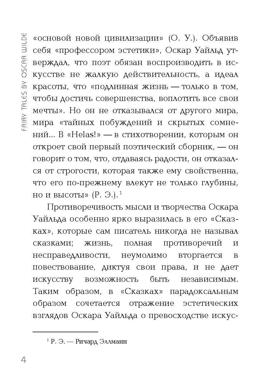 За сказочностью мотивов и "декоративным" стилем повествования скрываются важнейшие нравственные проблемы. В сказках отразились эстетические взгляды Оскара Уайльда на искусство, задачу которого писатель видел в сотворении красоты, недоступной действительной жизни. Для изучающих английский язык "Сказки" являются ценным учебным пособием, которое не только знакомит с удивительным миром Оскара Уайльда, но и способствует развитию навыков устной и письменной речи.