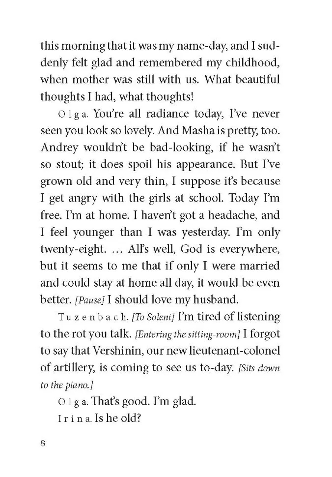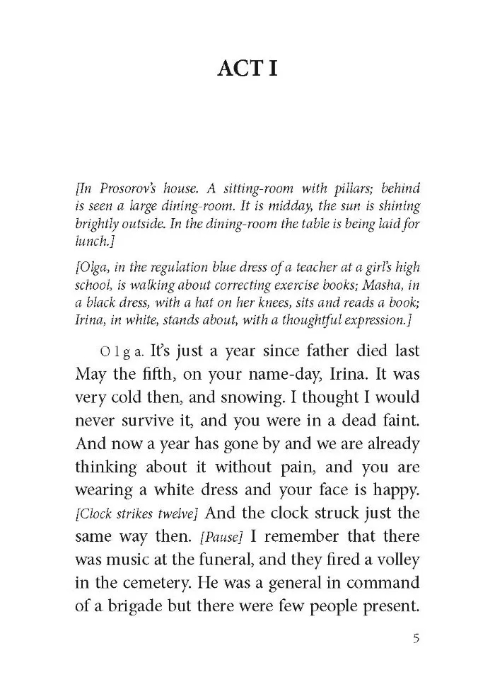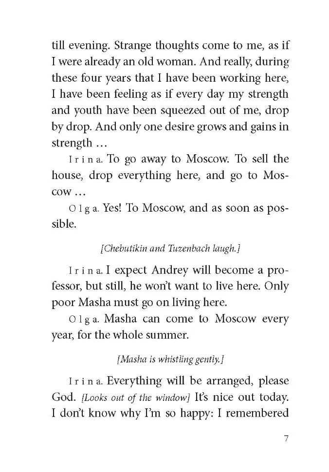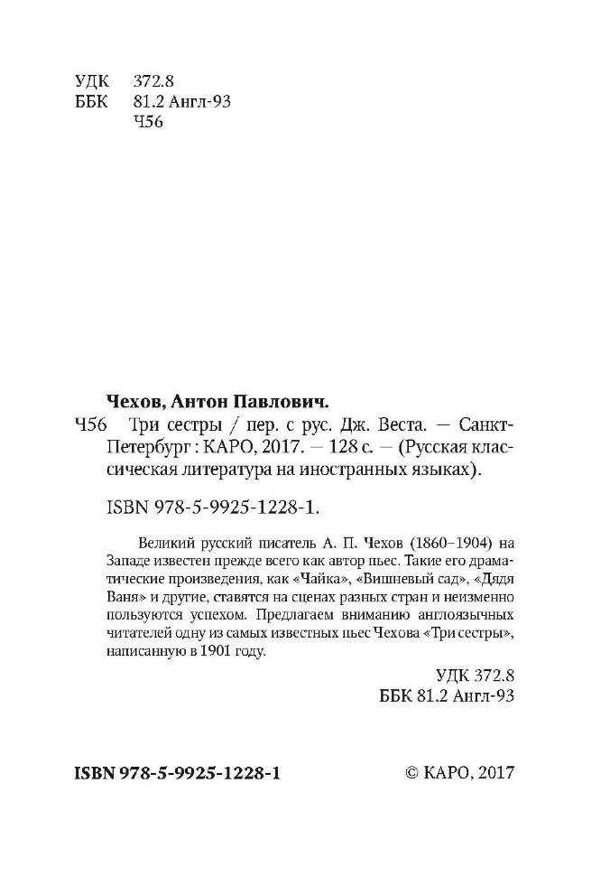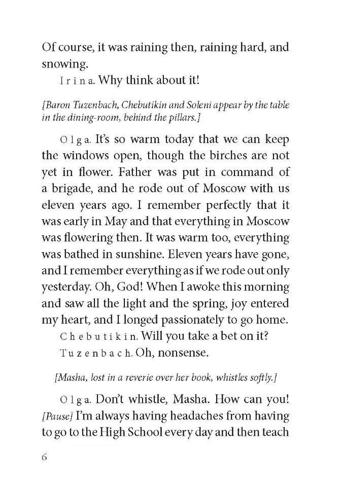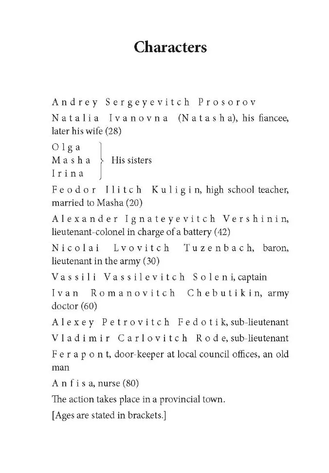 Великий русский писатель А. П. Чехов (1860-1904) па Западе известен прежде всего как автор пьес Такие его драматические произведения, как "Чайка", "Вишневый сад", "Дядя Ваня" и другие, ставятся на сценах разных стран и неизменно пользуются успехом. Предлагаем вниманию англоязычных читателей одну из самых известных пьес Чехова "Три сестры", написанную в 1901 году.