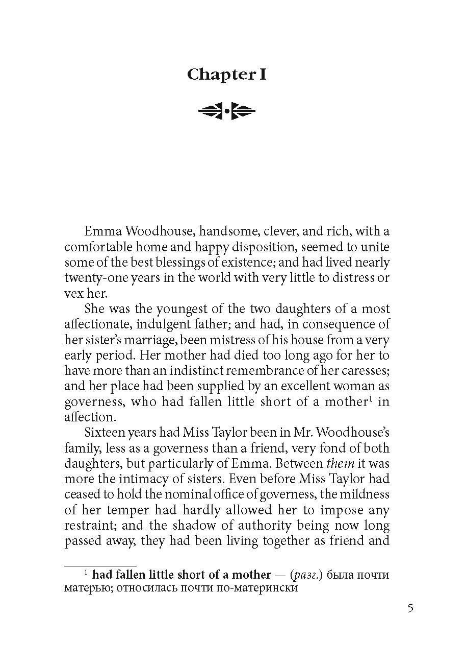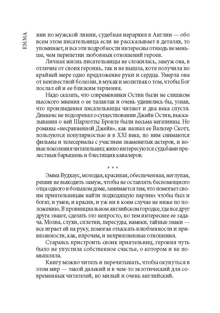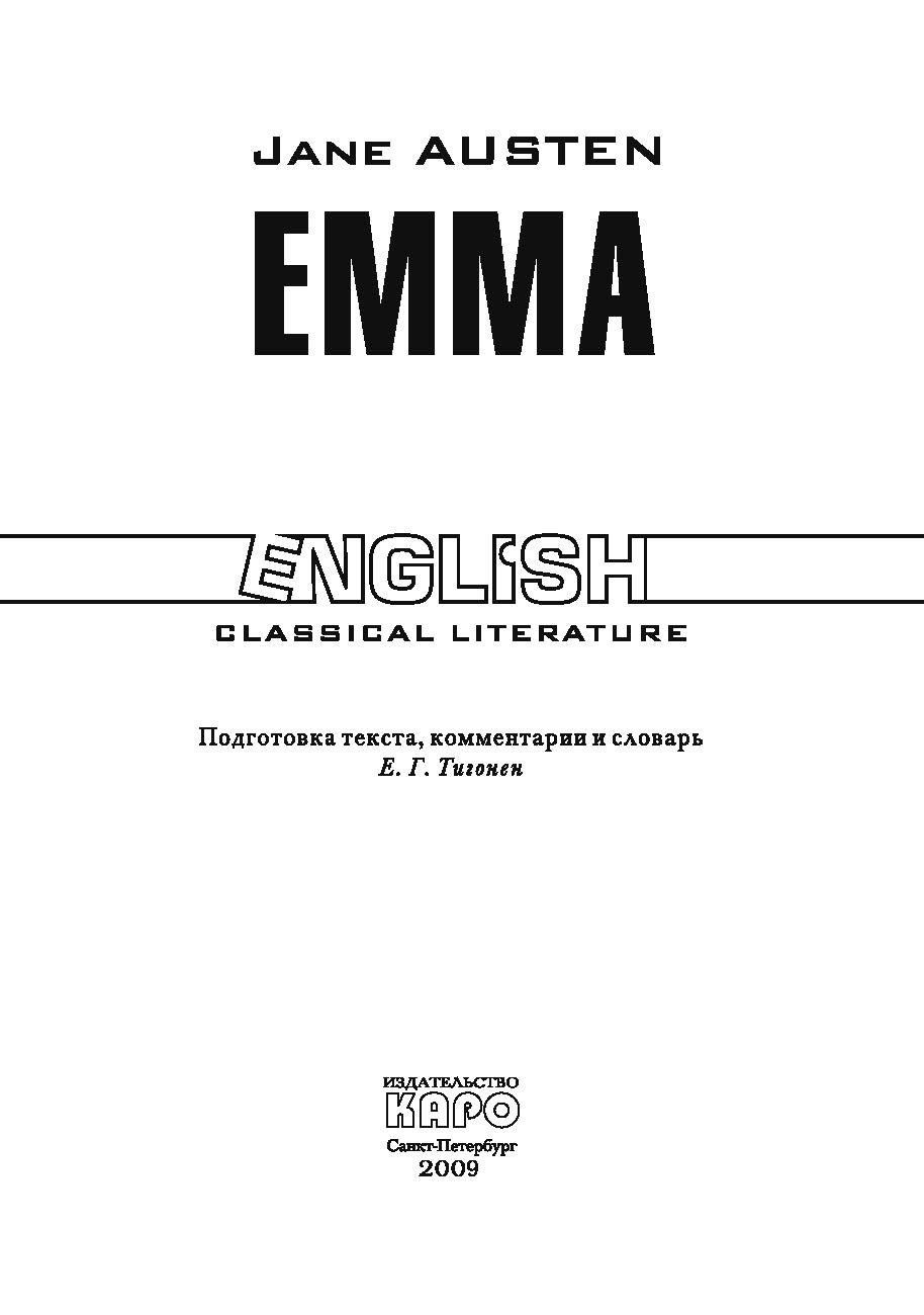 Предлагаем вниманию читателей роман замечательной английской писательницы Джейн Остин "Эмма", который, как и все произведения писательницы, можно назвать энциклопедией английской деревенской жизни. Эмма Вудхаус, молодая, красивая, обеспеченная, неглупая, решив не выходить замуж, чтобы не оставлять беспомощного отца одного в большом доме, занимается тем, что помогает своим приятельницам найти подходящую партию: чтобы был и богат, и умен, и красив, и уж не в коем случае не ниже по положению. В провинциальном английском городке, где все друг друга знают, сделать это непросто, но тем интереснее ее задача. Стараясь пристроить своих приятельниц, героиня чуть было не упустила собственное счастье, о котором и не помышляла.