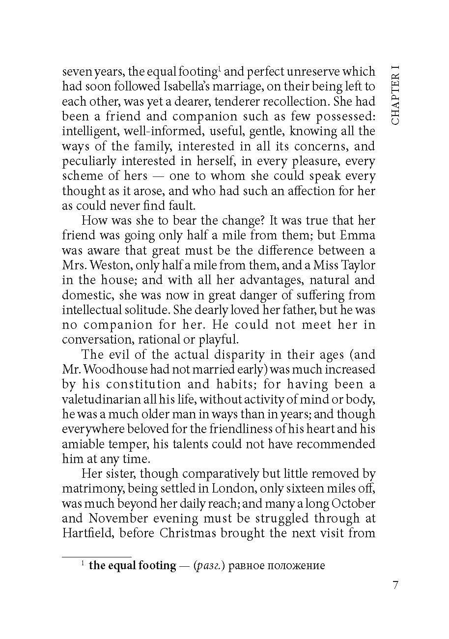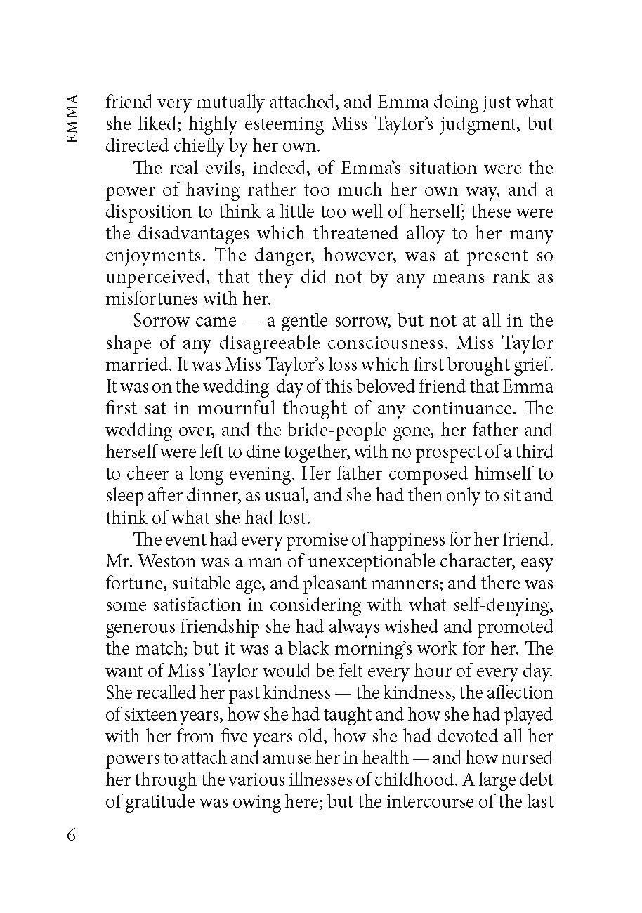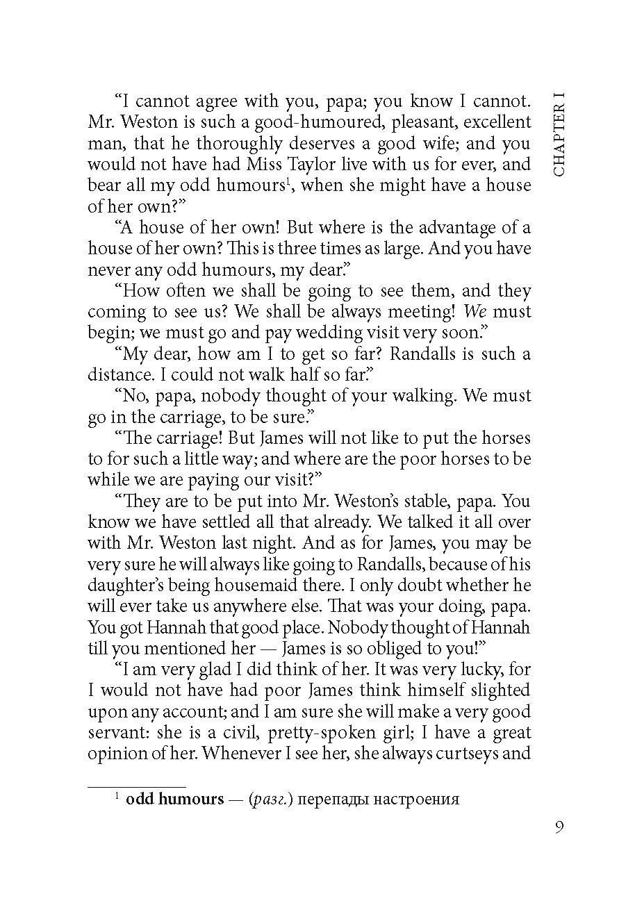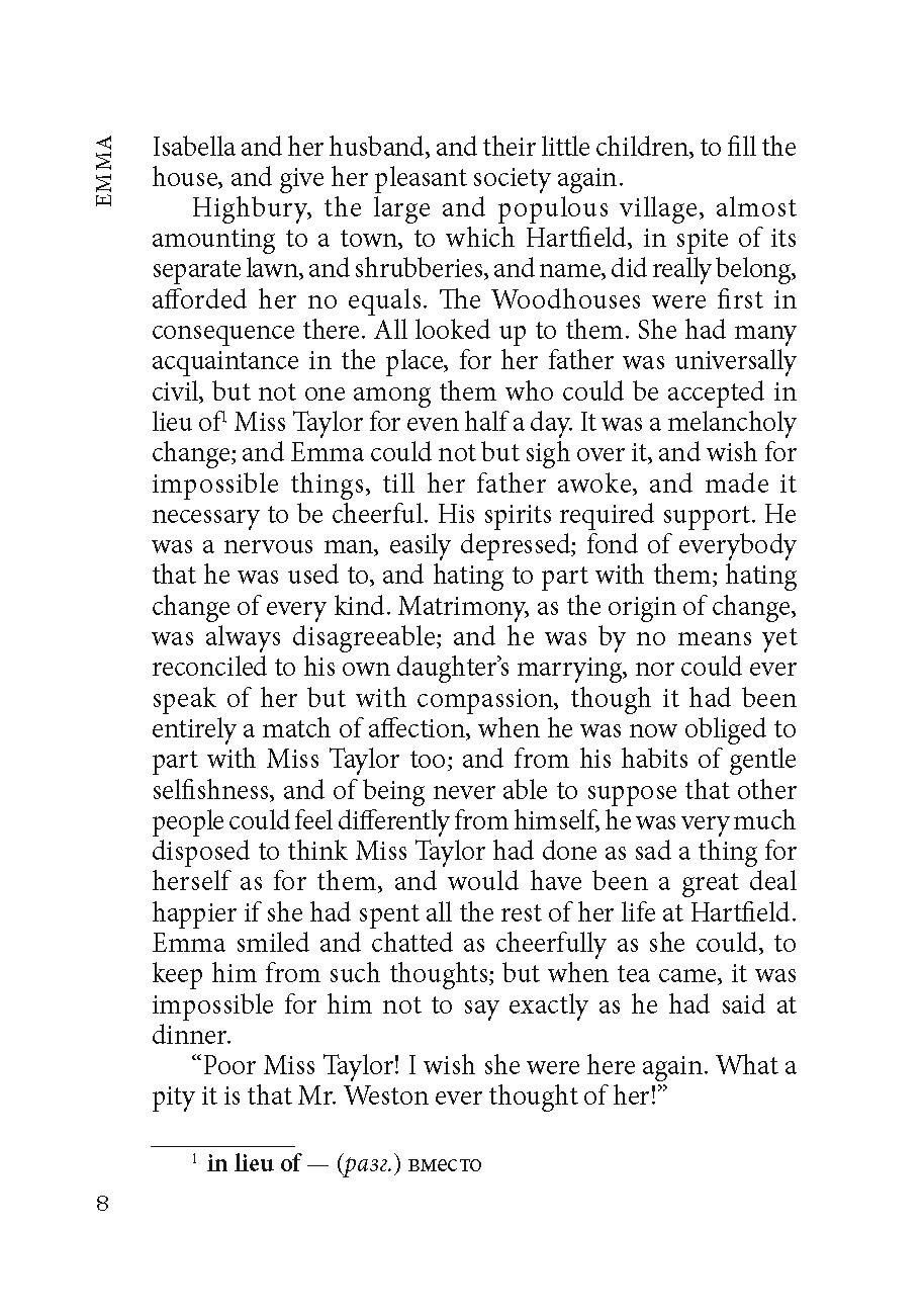 Предлагаем вниманию читателей роман замечательной английской писательницы Джейн Остин "Эмма", который, как и все произведения писательницы, можно назвать энциклопедией английской деревенской жизни. Эмма Вудхаус, молодая, красивая, обеспеченная, неглупая, решив не выходить замуж, чтобы не оставлять беспомощного отца одного в большом доме, занимается тем, что помогает своим приятельницам найти подходящую партию: чтобы был и богат, и умен, и красив, и уж не в коем случае не ниже по положению. В провинциальном английском городке, где все друг друга знают, сделать это непросто, но тем интереснее ее задача. Стараясь пристроить своих приятельниц, героиня чуть было не упустила собственное счастье, о котором и не помышляла.