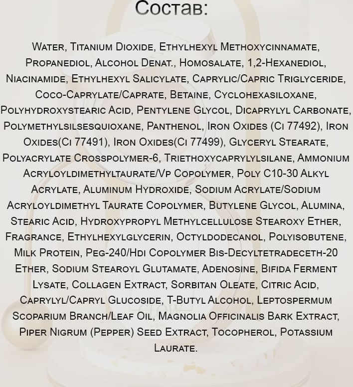 Water, Titanium Dioxide, Ethylhexyl Methoxycinnamate, Propanediol, Alcohol Denat., Homosalate, 1,2-hexanediol, Niacinamide, Ethylhexyl Salicylate, Caprylic/Capric Triglyceride, Coco-caprylate/Caprate, Betaine, Cyclohexasiloxane, Polyhydroxystearic Acid, Pentylene Glycol, Dicaprylyl Carbonate, Polymethylsilsesquioxane, Panthenol, Iron Oxides(ci 77492), Glyceryl Stearate, Polyacrylate Crosspolymer-6, Triethoxycaprylylsilane, Ammonium Acryloyldimethyltaurate/Vp Copolymer, Poly C10-30 Alkyl Acrylate, Iron Oxides(ci 77491), Aluminum Hydroxide, Sodium Acrylate/Sodium Acryloyldimethyl Taurate Copolymer, Butylene Glycol, Alumina, Stearic Acid, Hydroxypropyl Methylcellulose Stearoxy Ether, Fragrance, Ethylhexylglycerin, Octyldodecanol, Polyisobutene, Milk Protein, Peg-240/Hdi Copolymer Bis-decyltetradeceth-20 Ether, Sodium Stearoyl Glutamate, Adenosine, Iron Oxides(ci 77499), Bifida Ferment Lysate, Sorbitan Oleate, Citric Acid, Caprylyl/Capryl Glucoside, T-butyl Alcohol, Leptospermum Scoparium Branch/Leaf Oil, Magnolia Officinalis Bark Extract, Piper Nigrum (Pepper) Seed Extract, Tocopherol, Collagen Extract, Potassium Laurate.Мы используем файлы cookie для обеспечения удобства работы с сайтом и его контакта с пользователем.