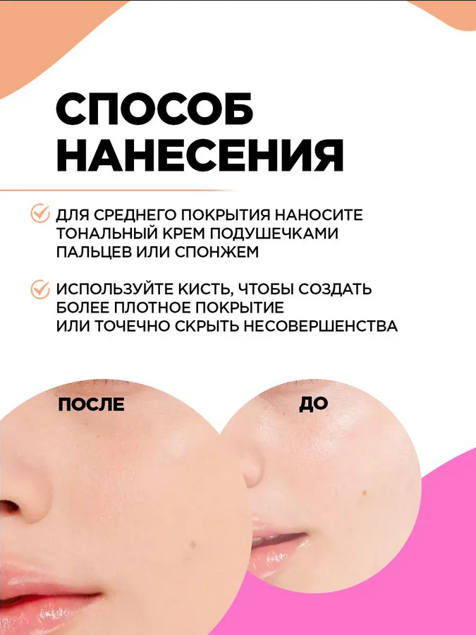 Плотный тональный крем с нежной кремовой текстурой равномерно наносится на кожу, идеально растушевывается, не подчеркивая шелушения, поры и не оставляя пятен.