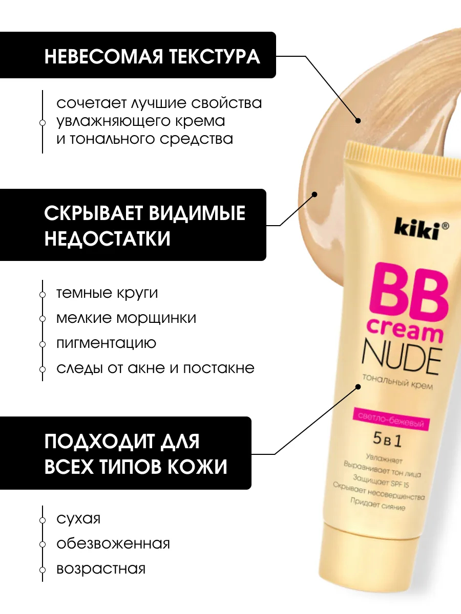 Тональный ВВ крем для лица KIKI NUDE Средство для безупречного естественного макияжа с невесомой текстурой, сочетает лучшие свойства увлажняющего крема и тонального средства. Тональный ВВ крем маскирует недостатки, делает кожу свежей и сияющей, а входящий в состав продукта SPF 15 обеспечивает ежедневную защиту от ультрафиолетовых лучей.