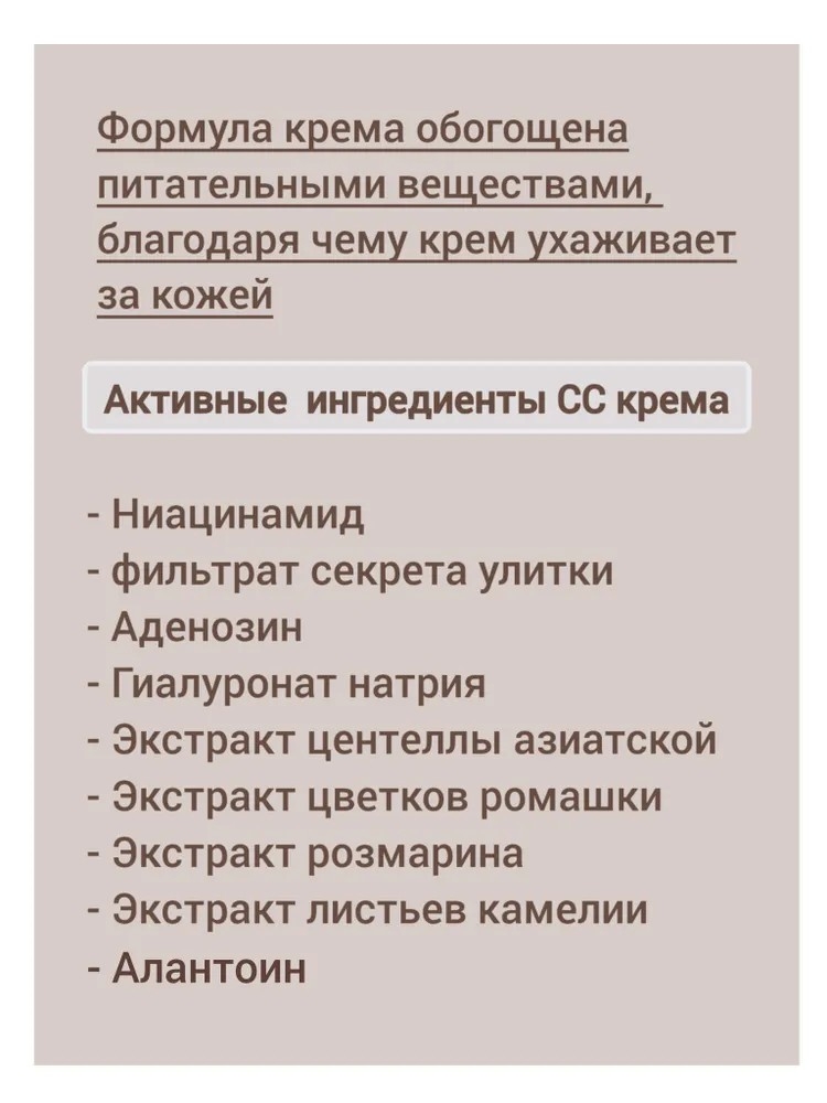 Формула крема обогащена питательными веществами, содержащимися в растительных экстрактах. Эти экстракты успокаивают и увлажняют кожу, обеспечивая комфорт даже для чувствительной кожи. Благодаря этому, CC-крем не только маскирует недостатки, но и активно ухаживает за кожей.