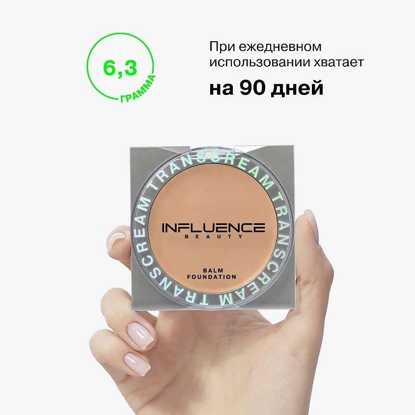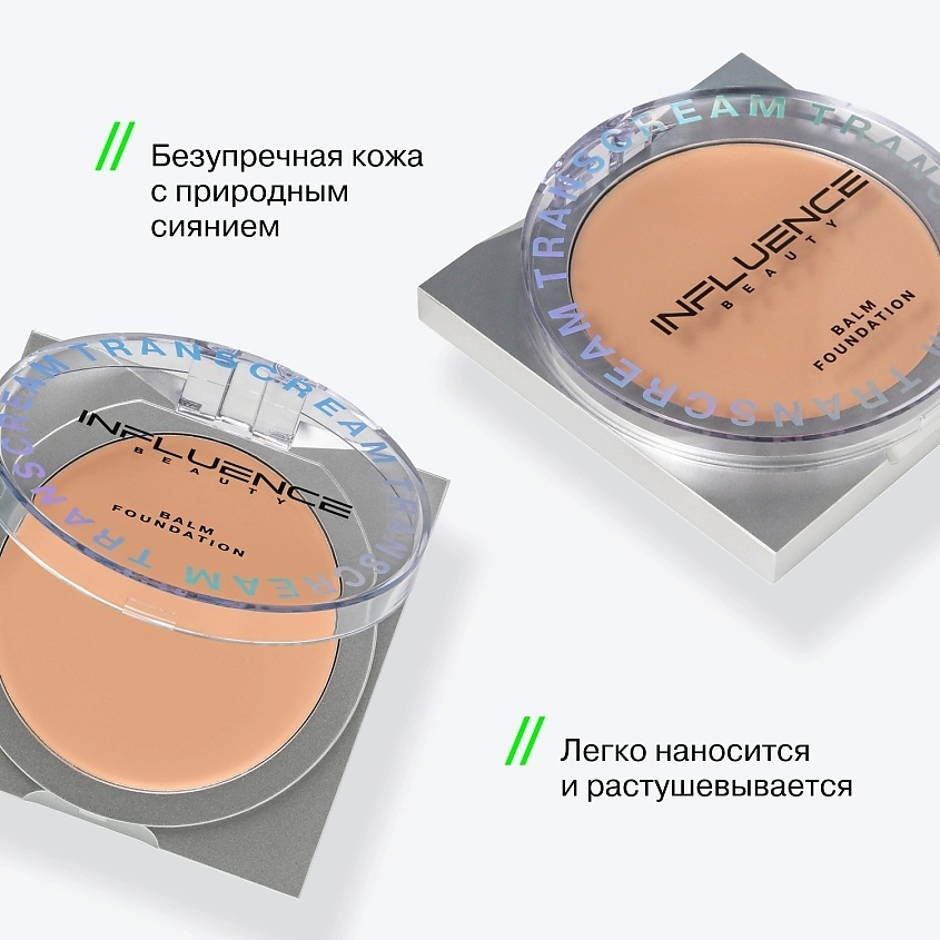 В изначальном состоянии продукт кажется твердым и плотным, но одно легкое касание – и Transcream превращается в пластичный невесомый крем. Он идеально ложится на кожу, создавая матовое естественное покрытие от легкого до среднего.