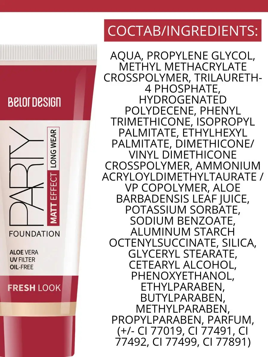Aqua, propylene glycol, methyl methacrylate crosspolymer, trilaureth-4 phosphate, hydrogenated polydecene, phenyl trimethicone, isopropyl palmitate, ethylhexyl palmitate, dimethicone/vinyl dimethicone crosspolymer, silica, aluminum starch octenylsuccinate, lauroyl lysine, ammonium acryloyldimethyltaurate/vp copolymer, aloe barbadensis leaf juice, sodium benzoate, potassium sorbate, cetearyl alcohol, glyceryl stearate, nylon-12, imidazolidinyl urea, methylparaben, propylparaben, parfum, butylphenyl methylpropional, linalool, hexyl сinnamal, coumarin, alpha-isomethyl ionone, hydroxyisohexyl 3-cyclohexene carboxaldehyde, (+/- ci 77491, ci 77492, ci 77499, ci 77891, mica).