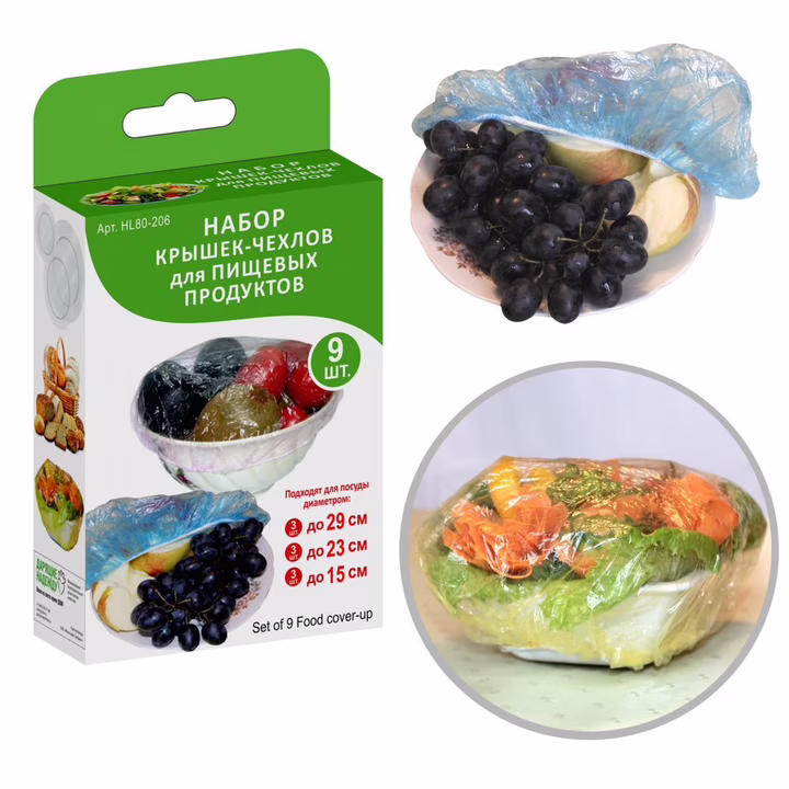 Крышки изготовлены из полиэтилена, оснащены резинкой, которая плотно прилегает к посуде. Подходят для посуды диаметром: 3шт.– до 40см, 3шт. – до 22см, 3шт. – до 16см. Подходят для использования с тарелками, салатницами, кувшинами, банками и т.д. Крышка закрывает ёмкость герметично и легко снимается.