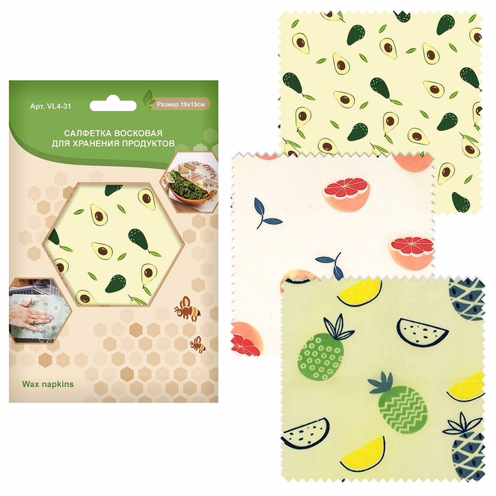 Восковая салфетка представляет собой пропитанную воском ткань, которую используют для хранения пищевых продуктов. В восковую салфетку можно завернуть половинки фруктов или овощей, зелень, сыр, бутерброд, а также прикрыть ею тарелку или контейнер. Это отличная альтернатива пищевой пленке.