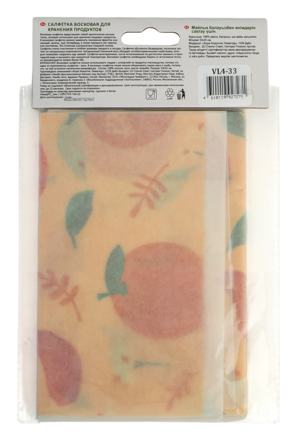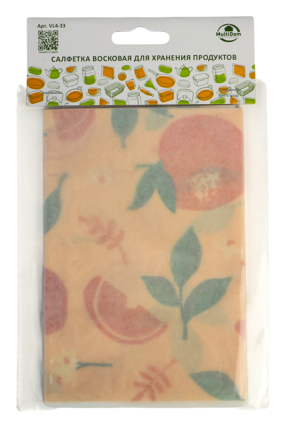 Салфетка очень пластичная и огибает размеры продукта и посуды. Салфетка абсолютно безвредная, поскольку состоит из натуральных компонентов. Натуральный пчелиный воск обладает антибактериальными свойствами, которые позволяют сохранять еду свежей.